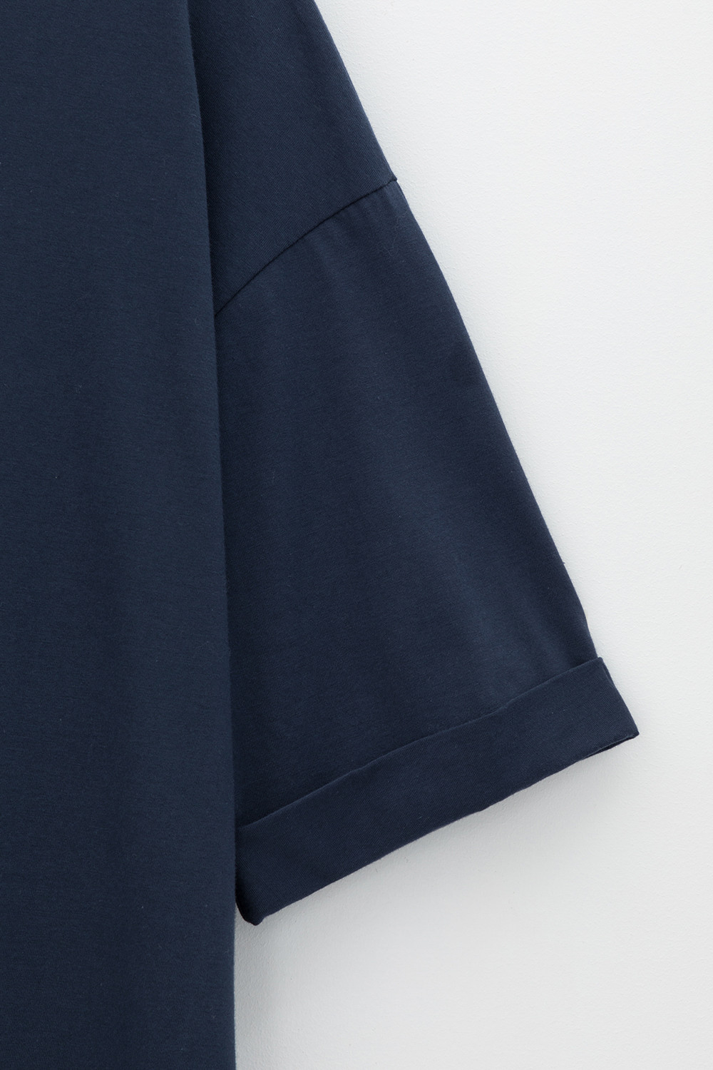 Удлиненное трикотажное платье из длинноволокнистого гребенного хлопка. Спущенное плечо придает изделию свободный силуэт.
