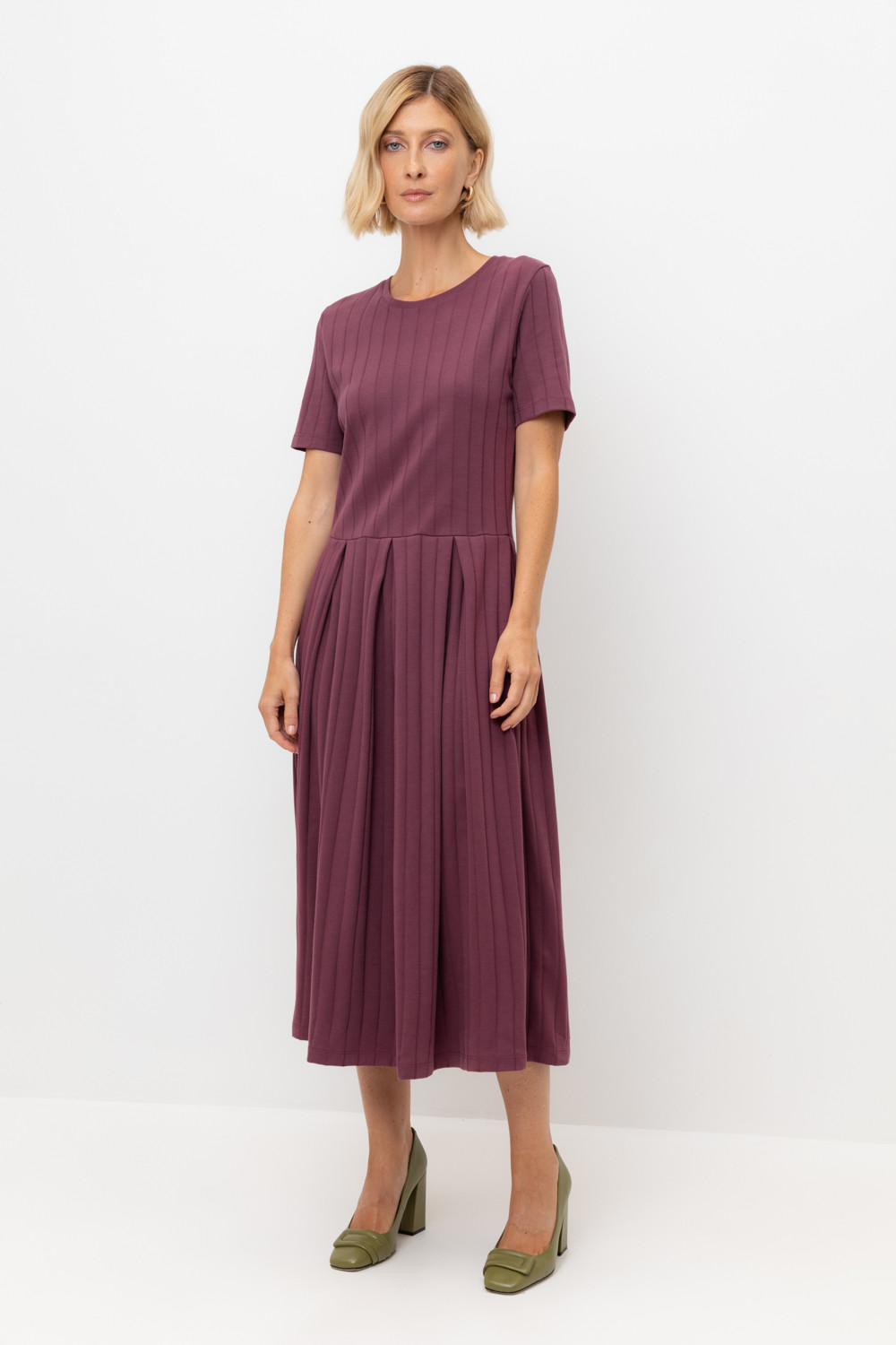Платье с круглым вырезом и короткими рукавами из плотного гладкого трикотажа интерлок в рубчик.                                                                                                                                Все трикотажные полотна производятся в соответствии с нормами Швейцарского сертификата ЭкоТекс. Сделано в России