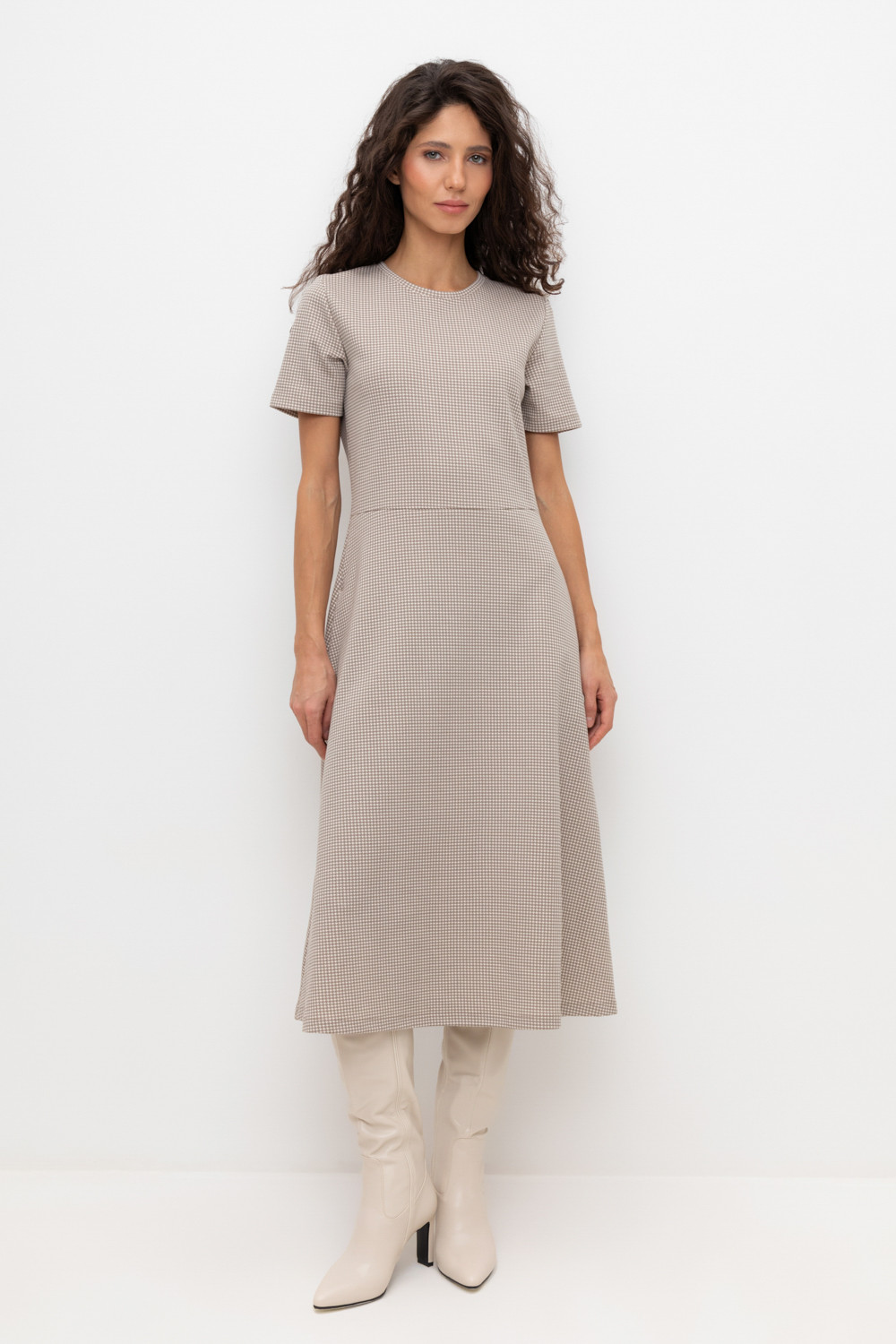 Платье с круглым вырезом и короткими рукавами из плотного набивного трикотажа интерлок. Модель с трапециевидной юбкой и боковыми карманами.