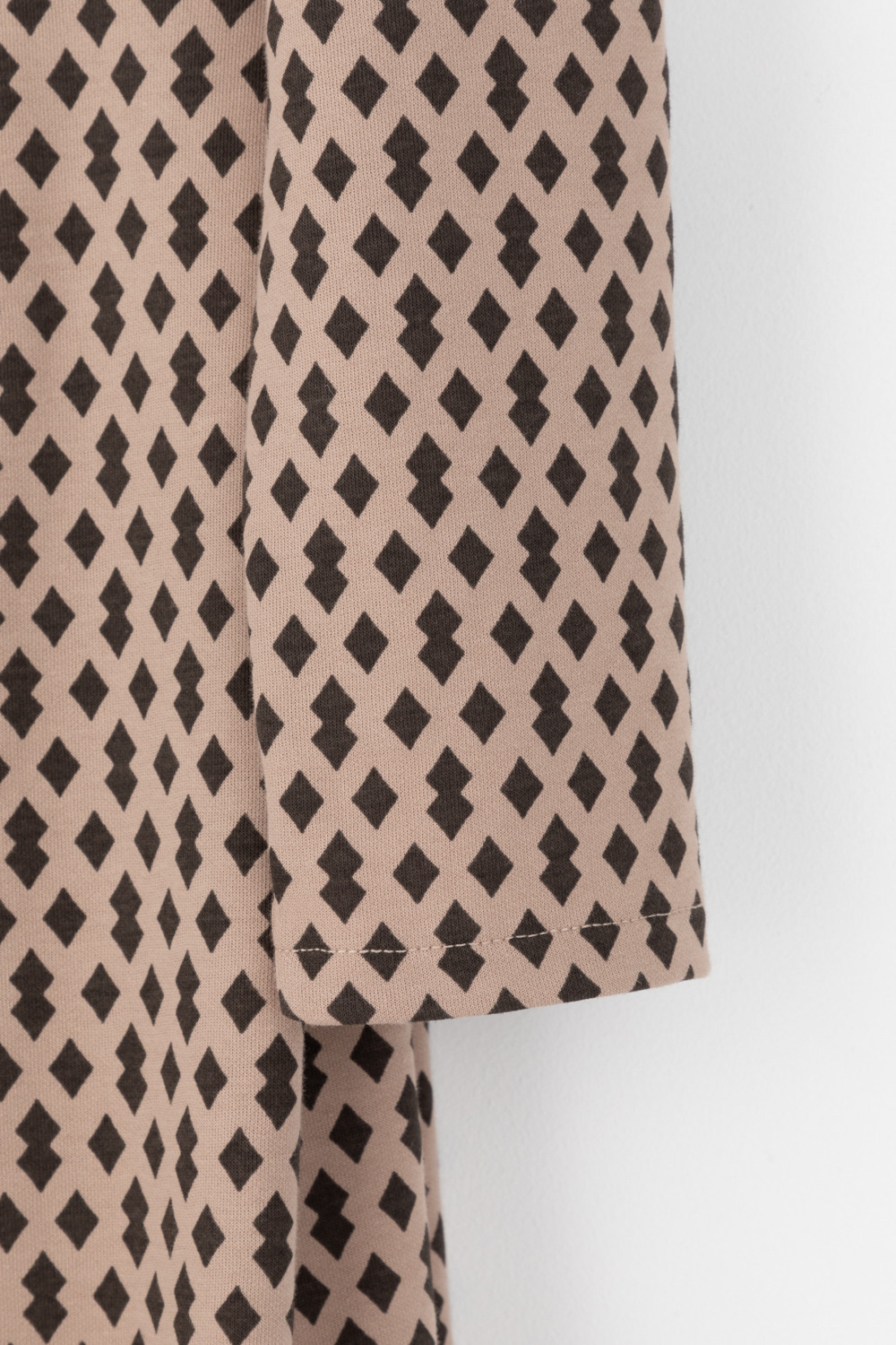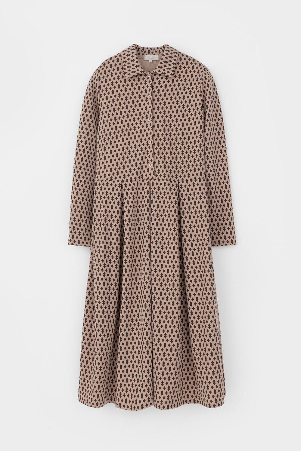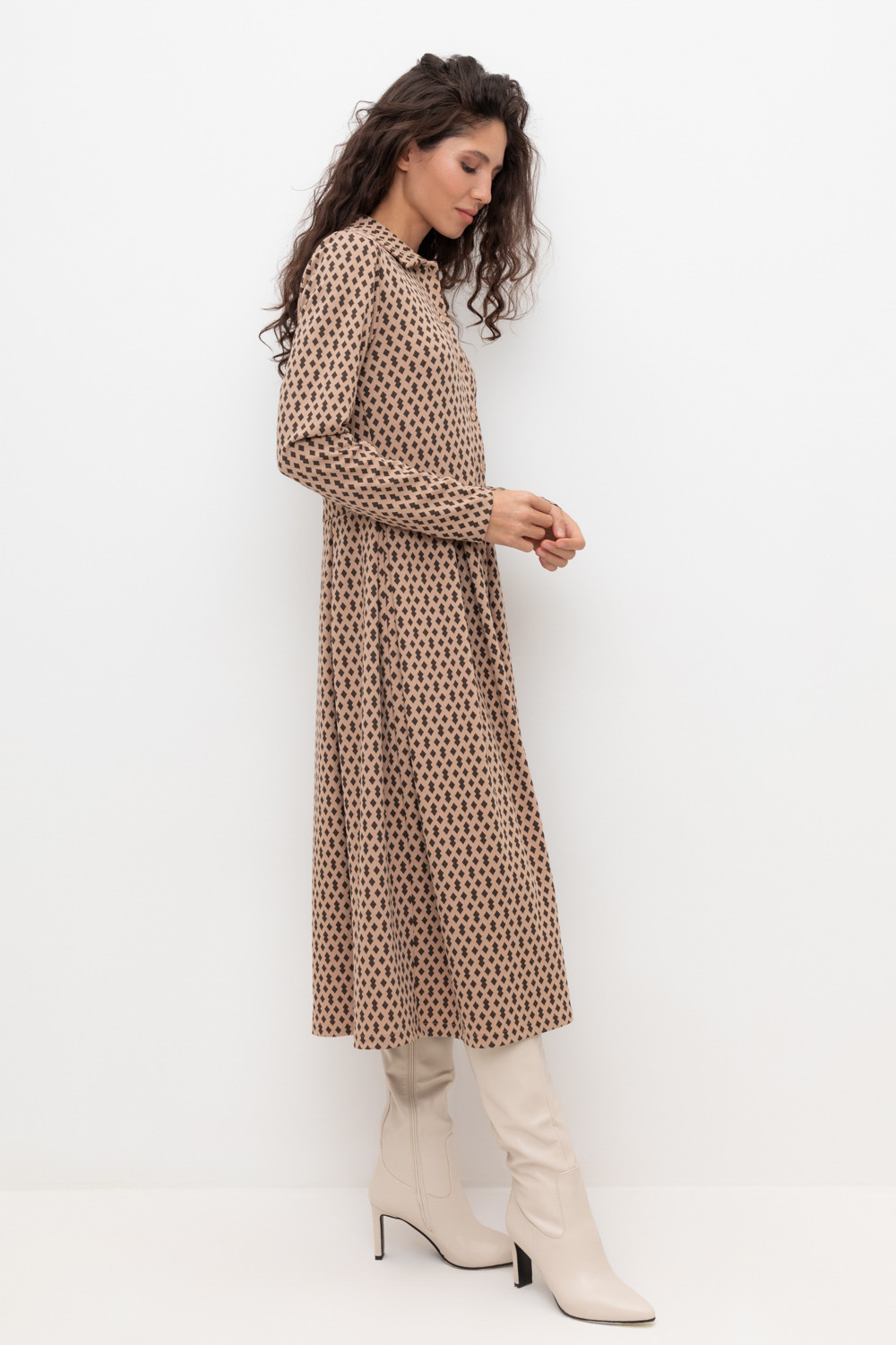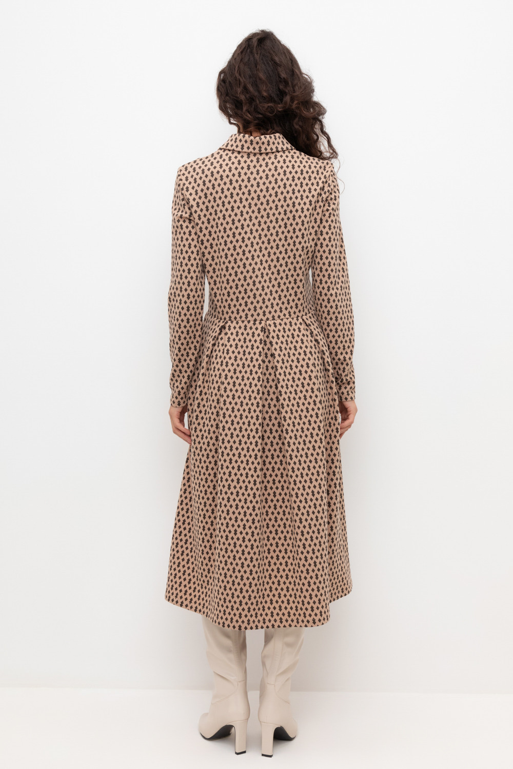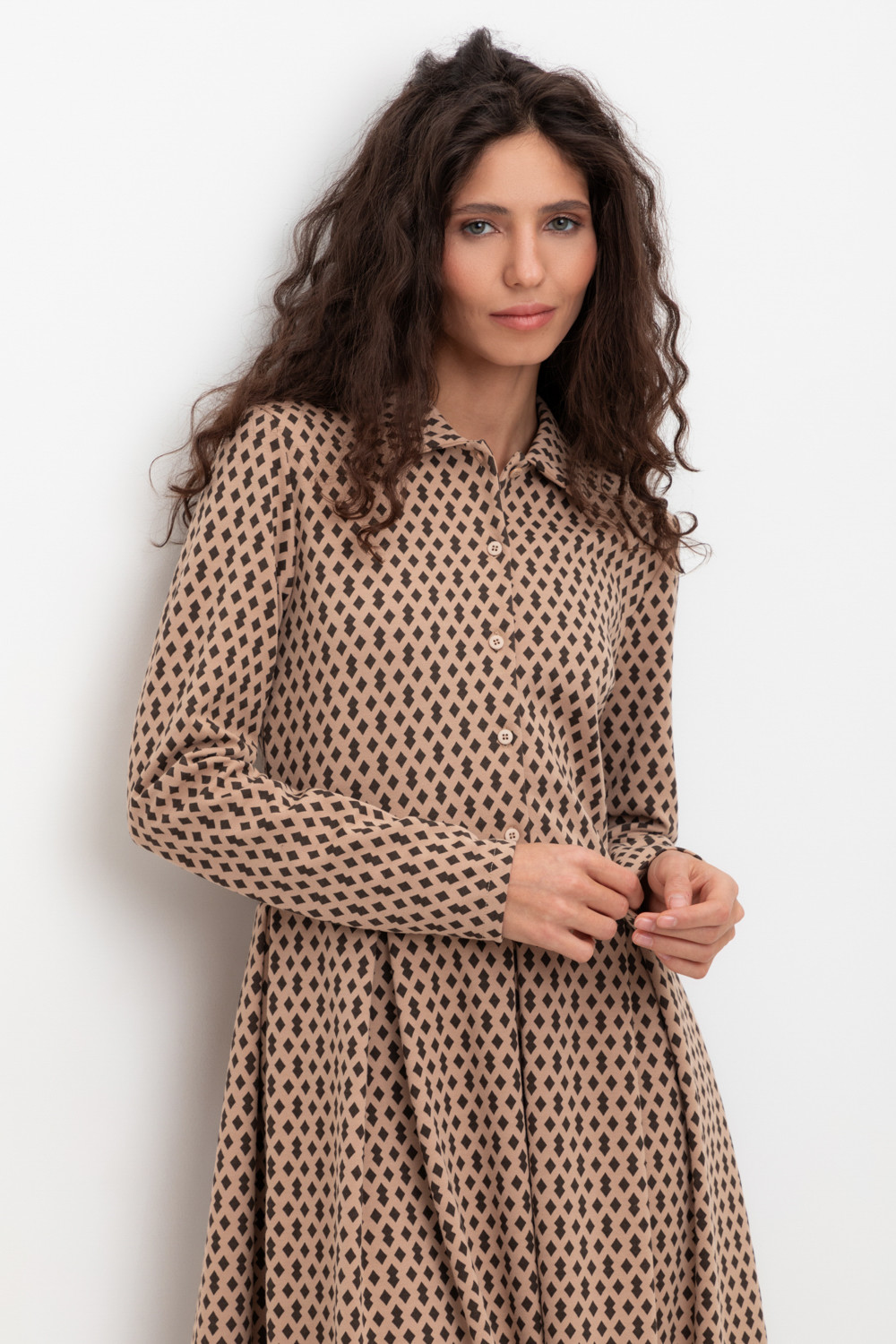 Платье с воротником из плотного набивного трикотажа интерлок. Модель с длинными рукавами и юбкой в складку.     Все трикотажные полотна производятся в соответствии с нормами Швейцарского сертификата ЭкоТекс. Сделано в России