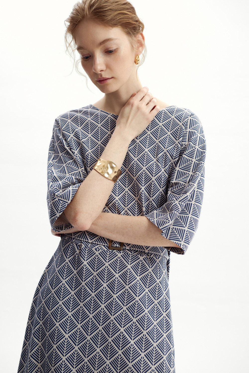 Текстурное платье из легкого хлопка. Основной акцент в дизайне платья — это цельнокроенный рукав, который обеспечивает идеальную посадку и свободу движений. Вырез на спине добавляет женственности, подчеркивая изящество фигуры. Съемный пояс из основного полотна позволяет регулировать силуэт, акцентируя внимание на талии.