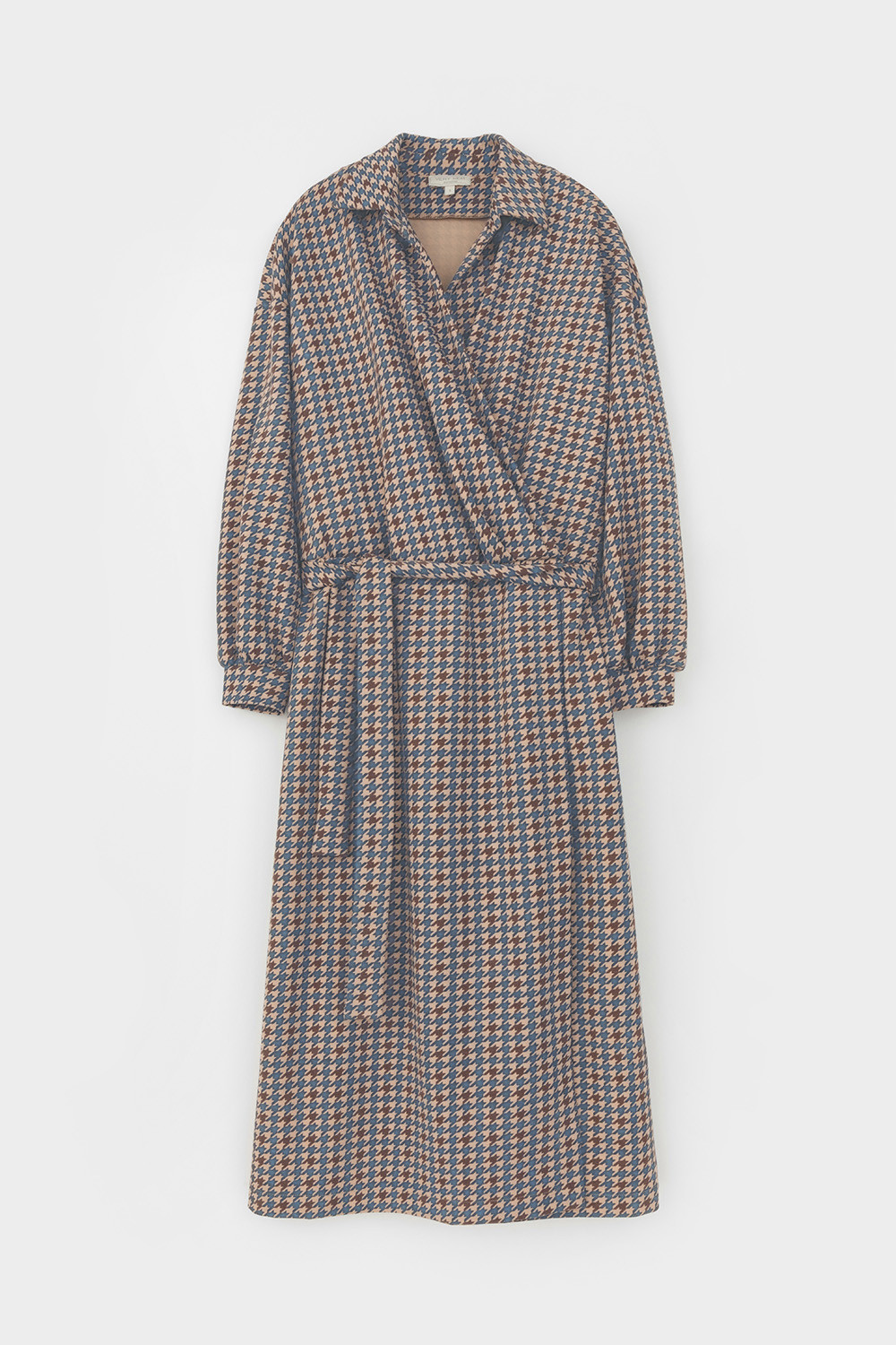 Платье на запах с воротником из плотного набивного трикотажа интерлок. Модель с длинными объемными рукавами. С помощью пояса можно регулировать посадку и силуэт.