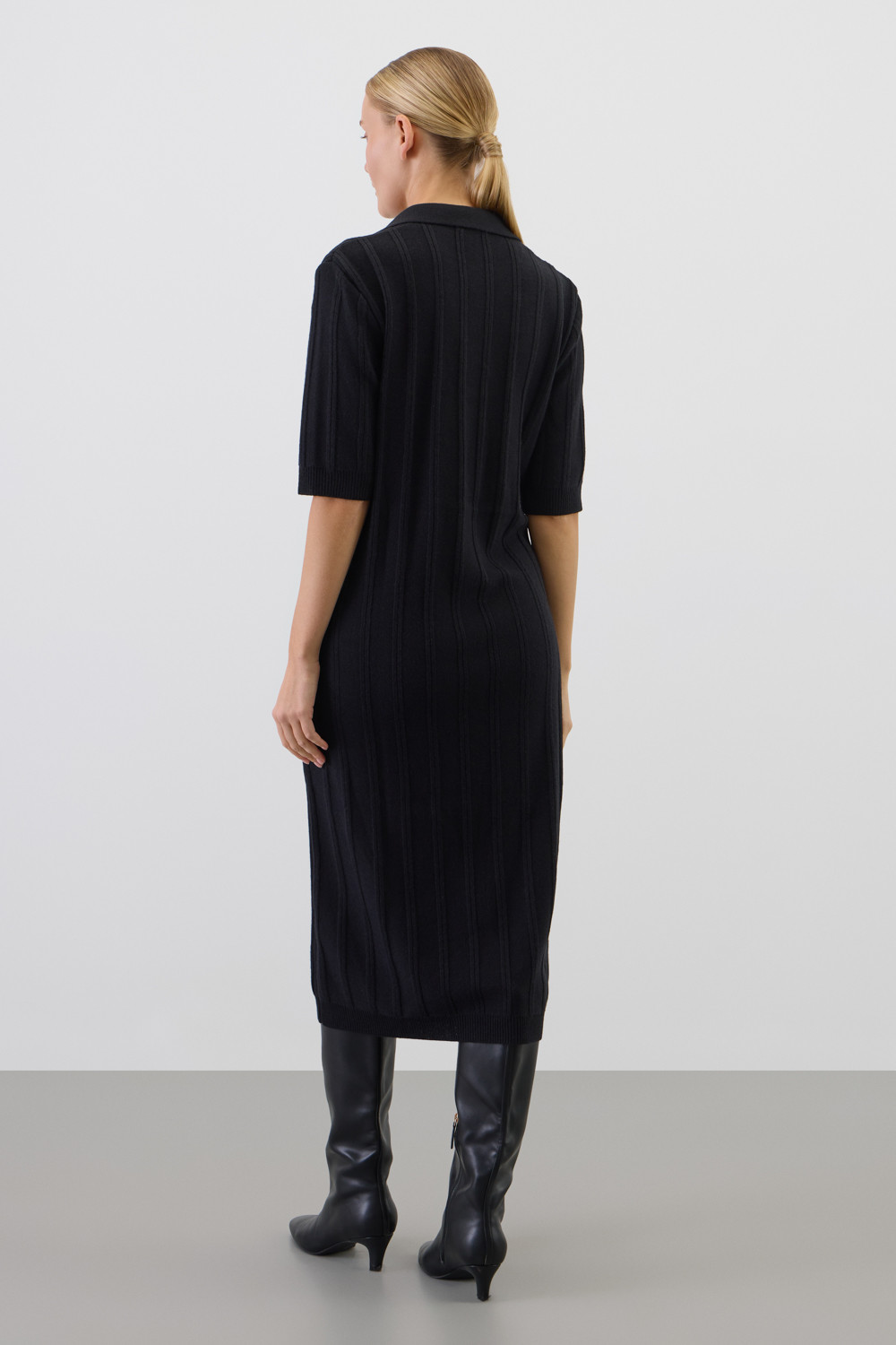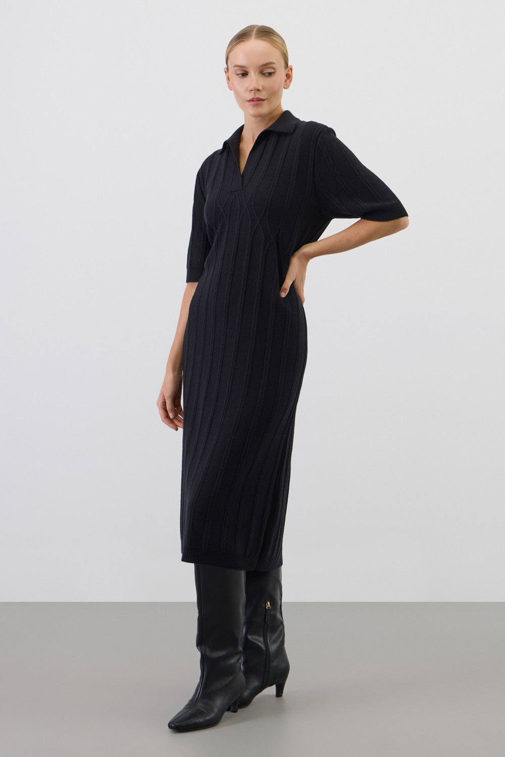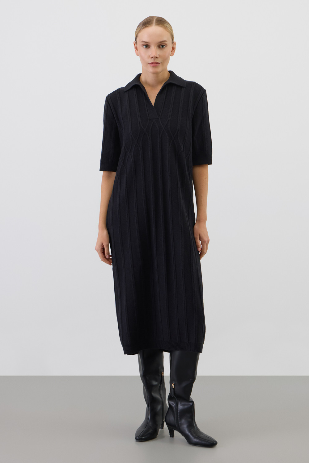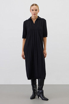 Платье-поло, изготовленное из австралийского мериноса. Натуральная шерсть обеспечивает комфорт, отличную терморегуляцию и высокую воздухопроницаемость. Элегантный воротник в стиле поло и короткие рукава формируют современный и универсальный силуэт, идеально подходящий как для офисных встреч, так и для прогулок по городу.