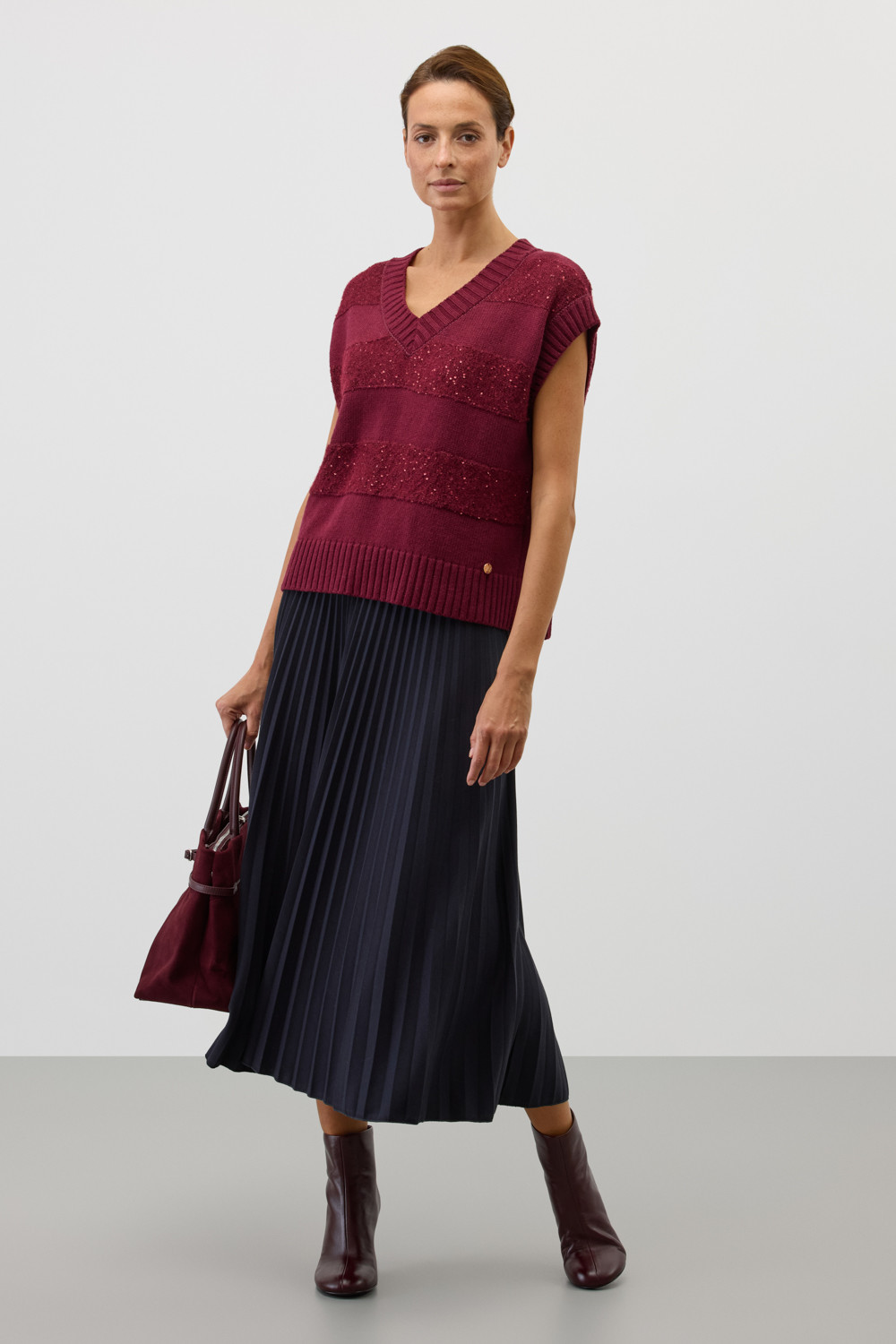 Жилет из изысканной пряжи с пайетками. Уникальное сочетание натуральных волокон обеспечивает непревзойденную мягкость. Меринос отлично удерживает тепло, альпака дарит легкость и воздушность, кашемир придает шелковистость, а вискоза приятный блеск. Нежные пайетки ненавязчиво мерцают при каждом движении, добавляя Вашему образу утонченную элегантность.