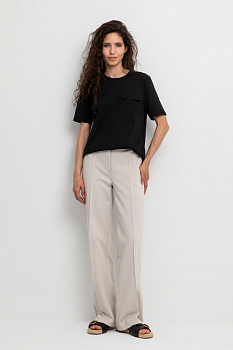 Свободные женские брюки со стрелками и боковыми карманами из плотного гладкого трикотажа интерлок. Застегиваются на молнию и кнопку. Низ обработан плоскими швами.