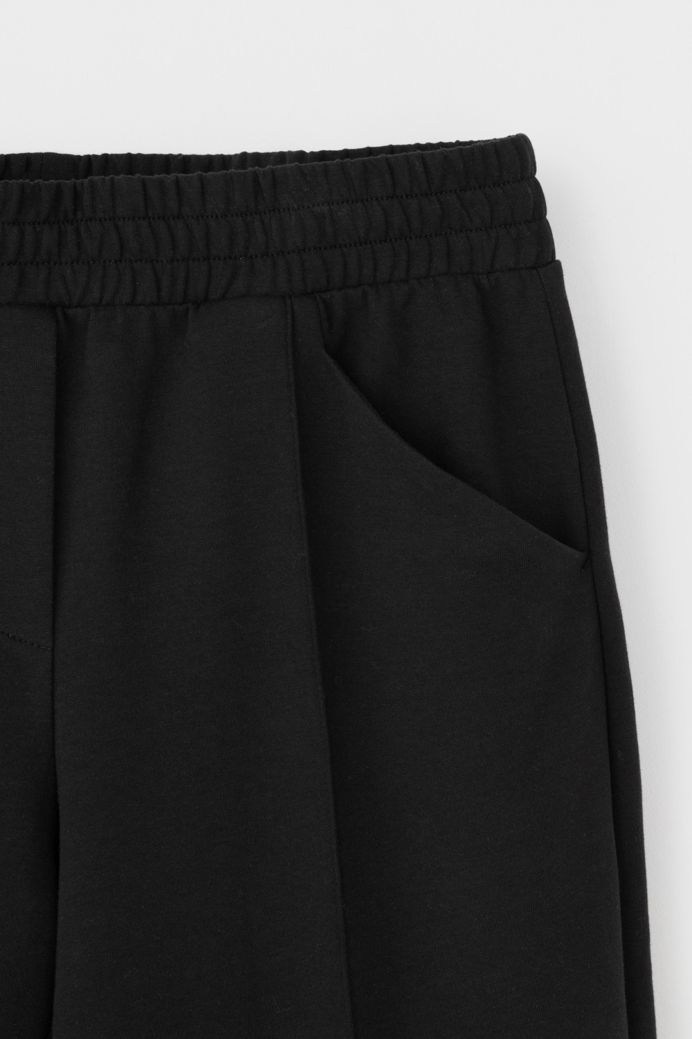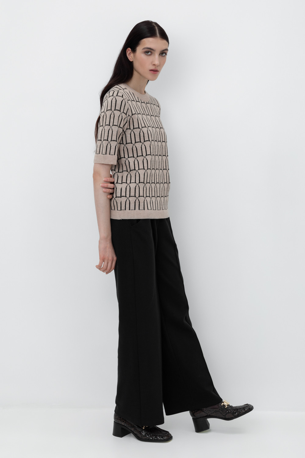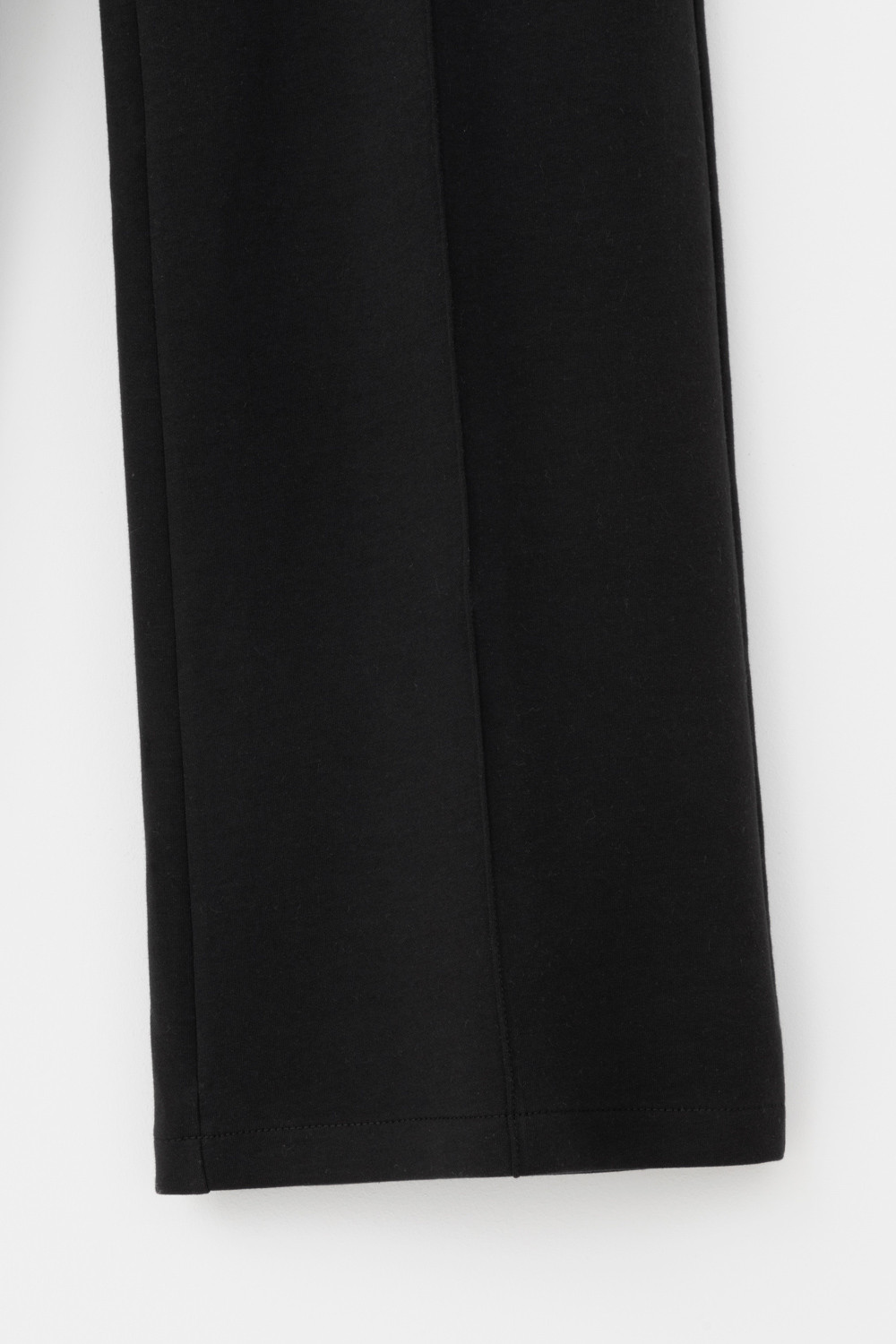 Брюки прямого кроя со стрелкой и боковыми карманами из плотного гладкого трикотажа интерлок.
