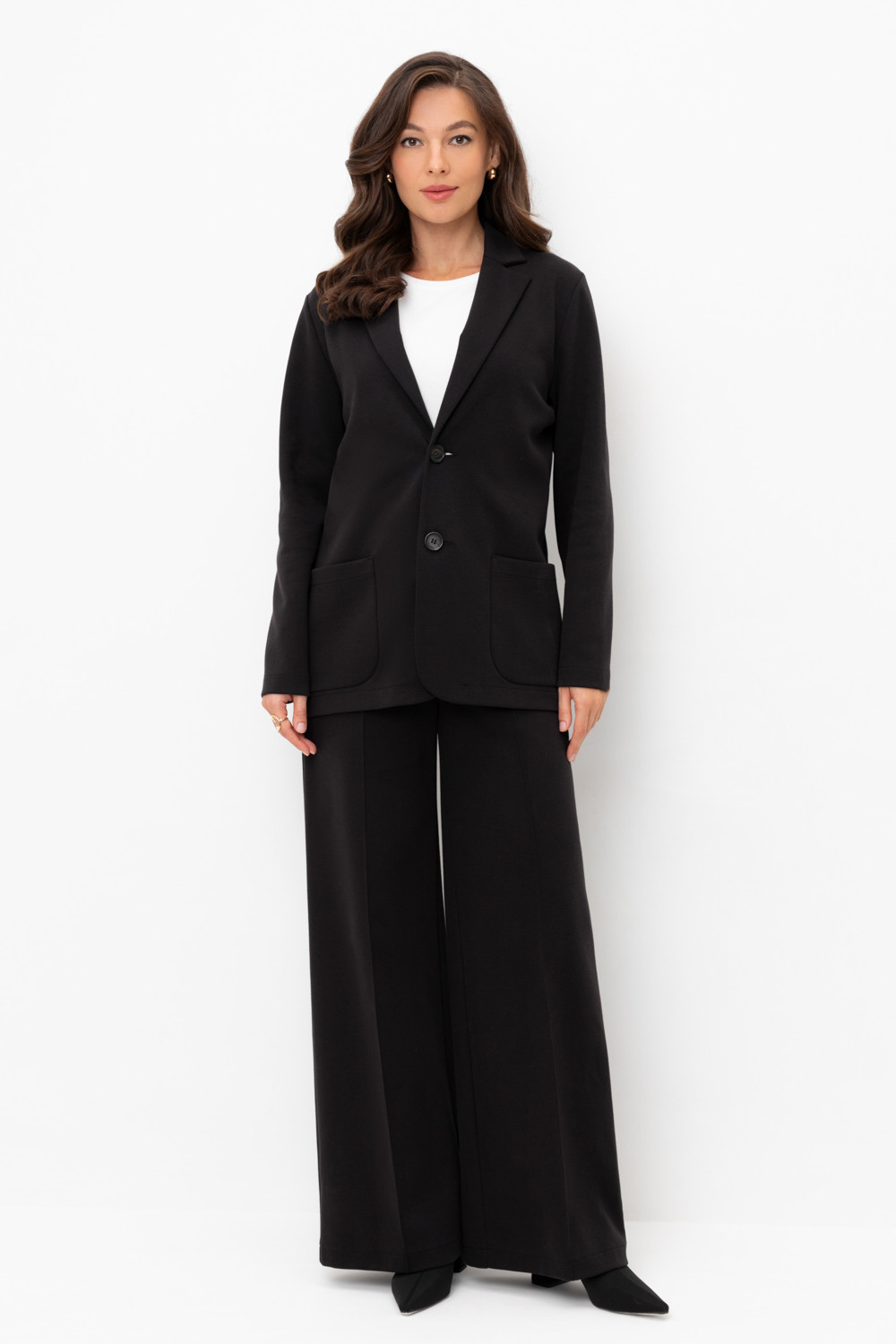 Свободные женские брюки со стрелкой и боковыми карманами из плотного гладкого трикотажа интерлок. Застежка на кнопку. Низ обработан плоскими швами.