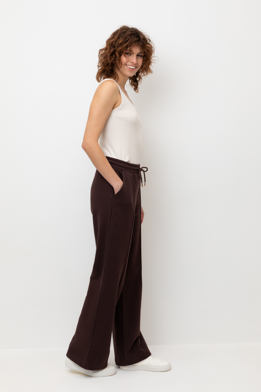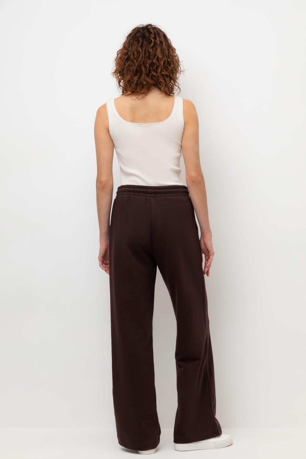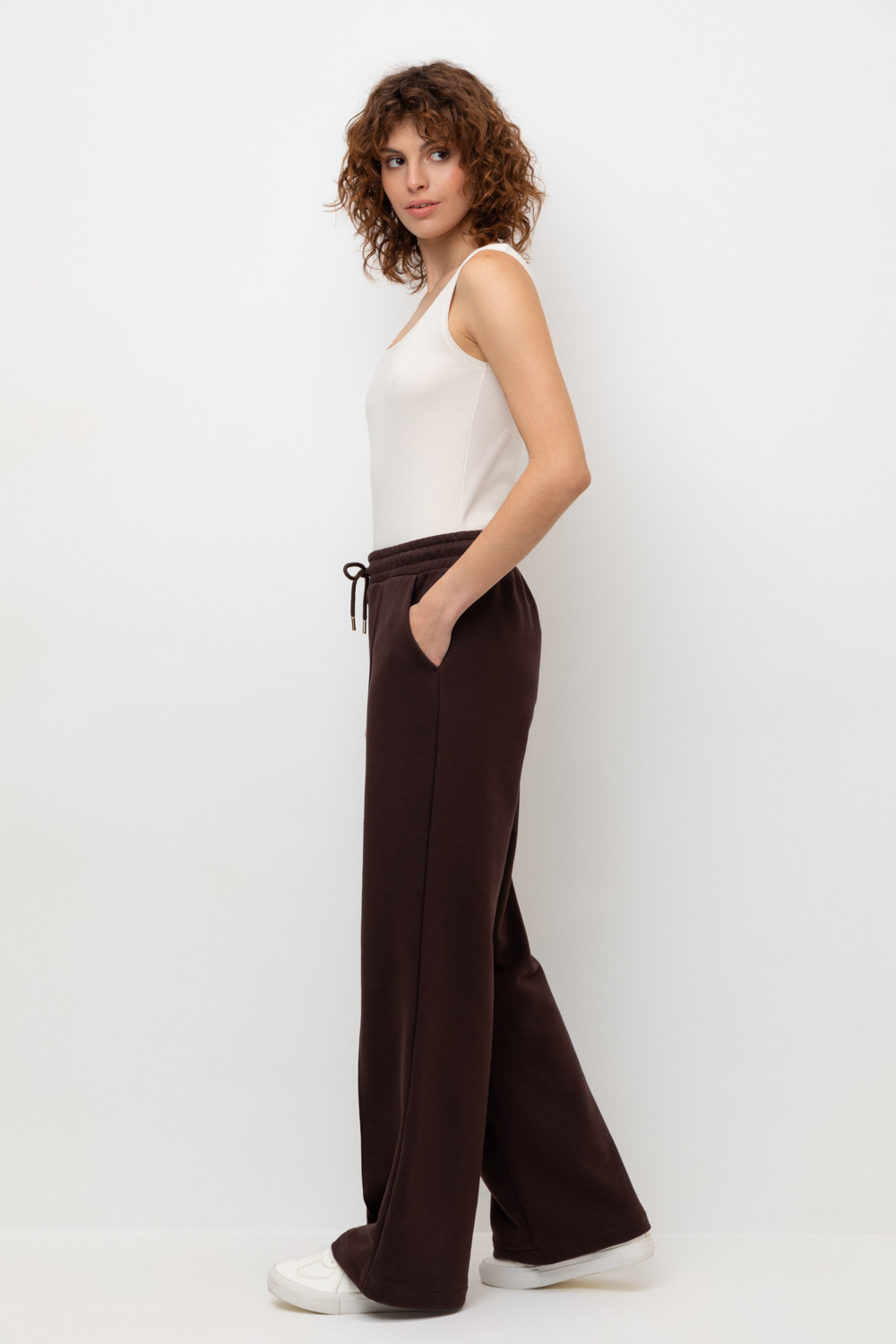 Брюки прямого кроя со стрелкой и боковыми карманами из мягкого петельчатого футера. В составе 80% натурального хлопка и 20% полиэстера, при этом полиэстер ввязан внутрь по особой технологии и не соприкасается с кожей. Пояс со шнурком позволяет регулировать посадку. Идеальный и комфортный вариант на каждый день.