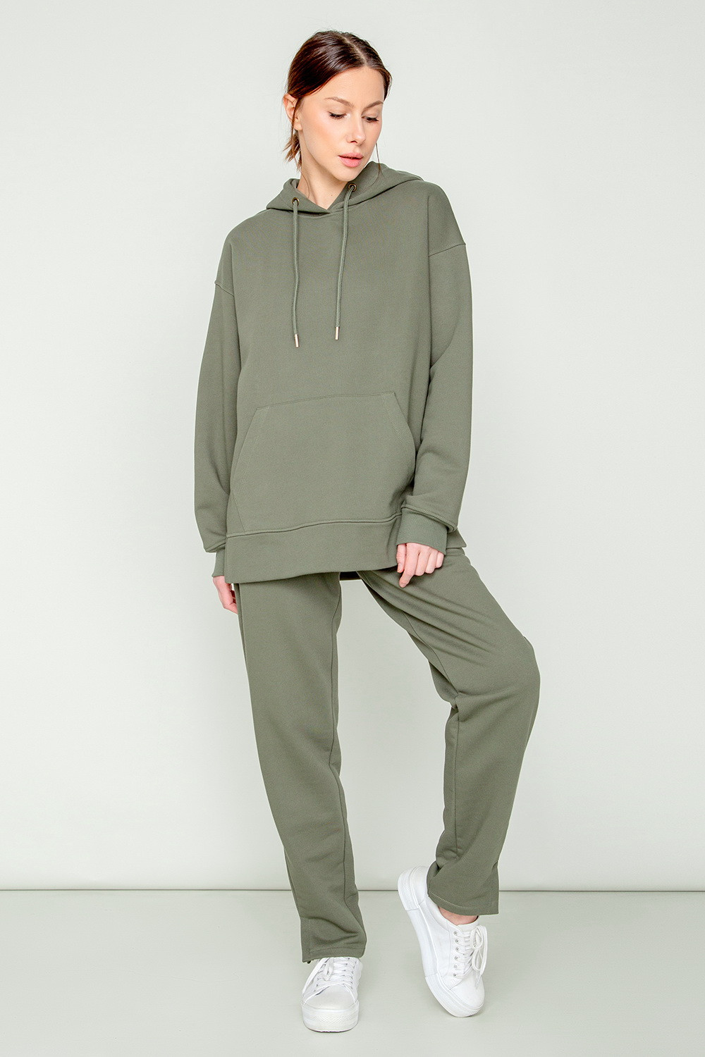 Брюки прямого кроя с боковыми карманами из петельчатого футера трехнитки. Гладкий и плотный материал на основе хлопка сохраняет форму.
