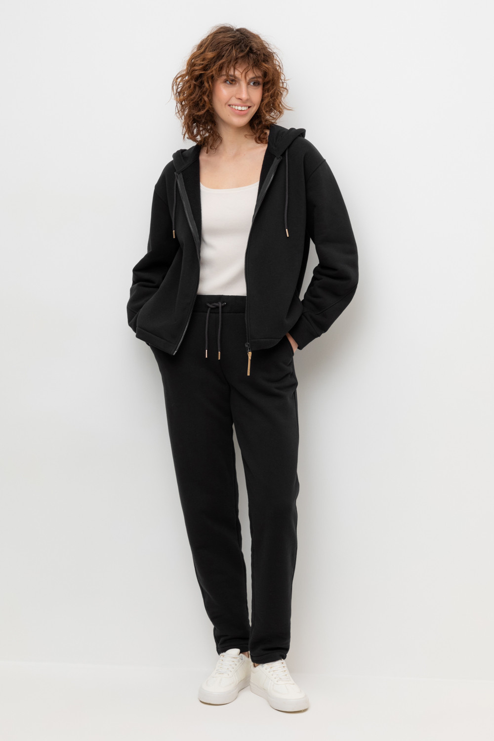 Брюки прямого кроя с боковыми карманами из футера трехнитки с начесом. Гладкий и плотный материал на основе хлопка сохраняет форму.