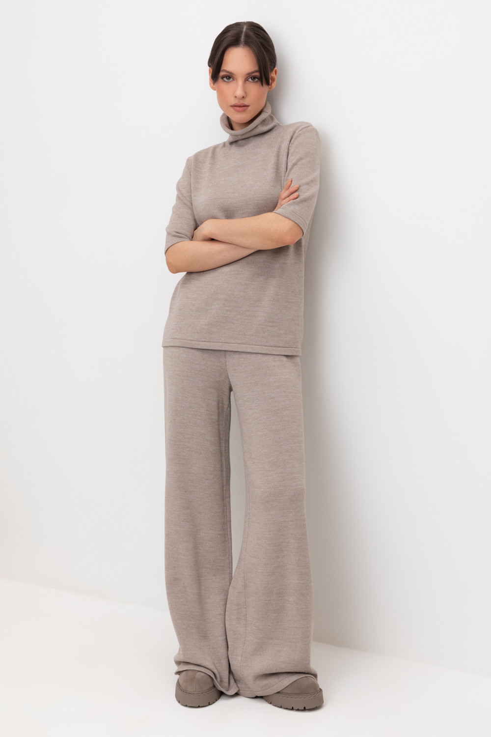 Удобные свободные вязаные брюки выполнены из мягкой полушерстяной пряжи. Шерсть в составе сохраняет тепло, а благодаря волокнам акрила изделие мягкое и дольше сохраняет форму.