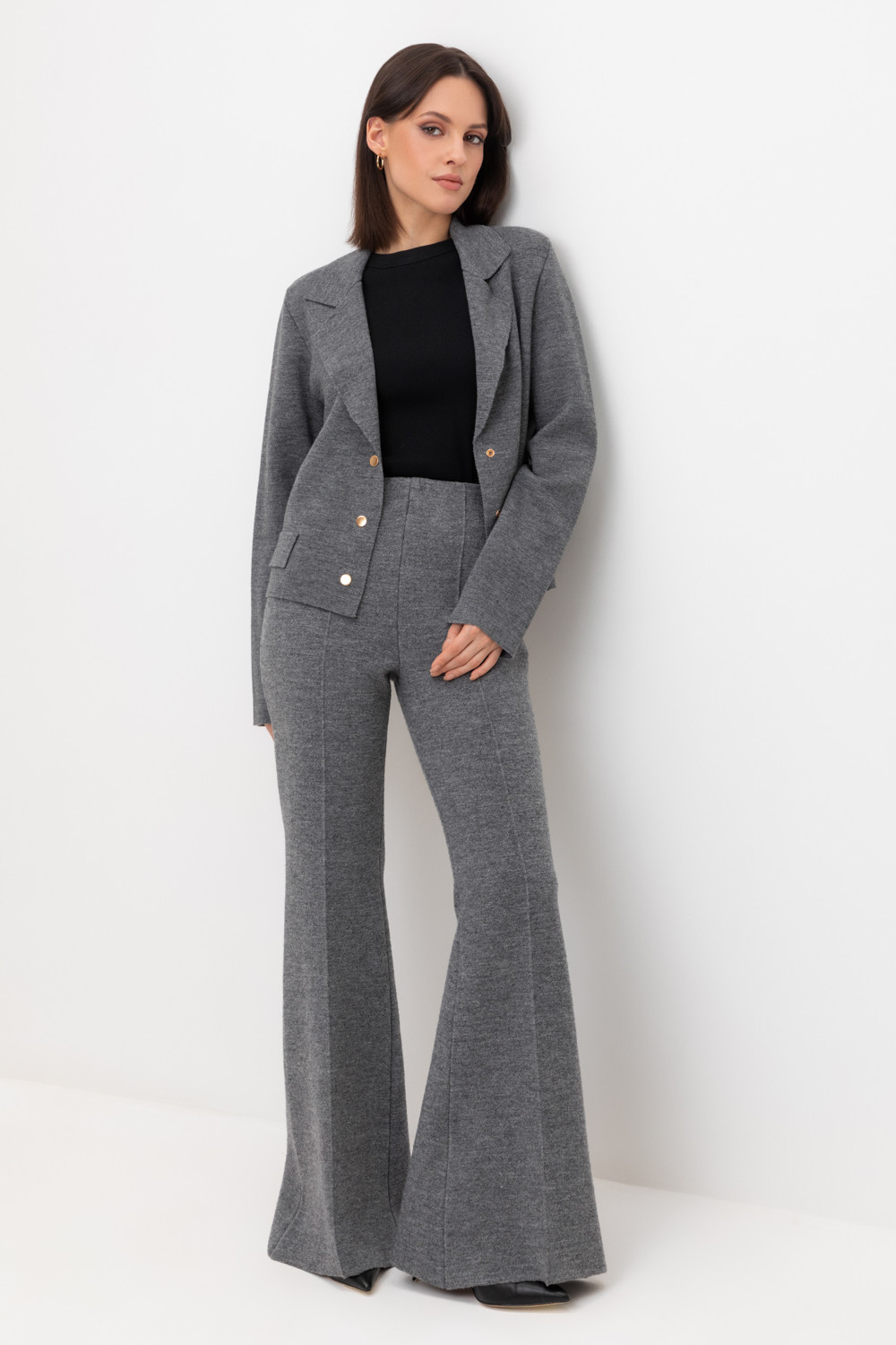 Удобные вязаные брюки со стрелкой из 100% шерсти. Шерсть в составе хорошо сохраняет тепло. Пояс на резинке.