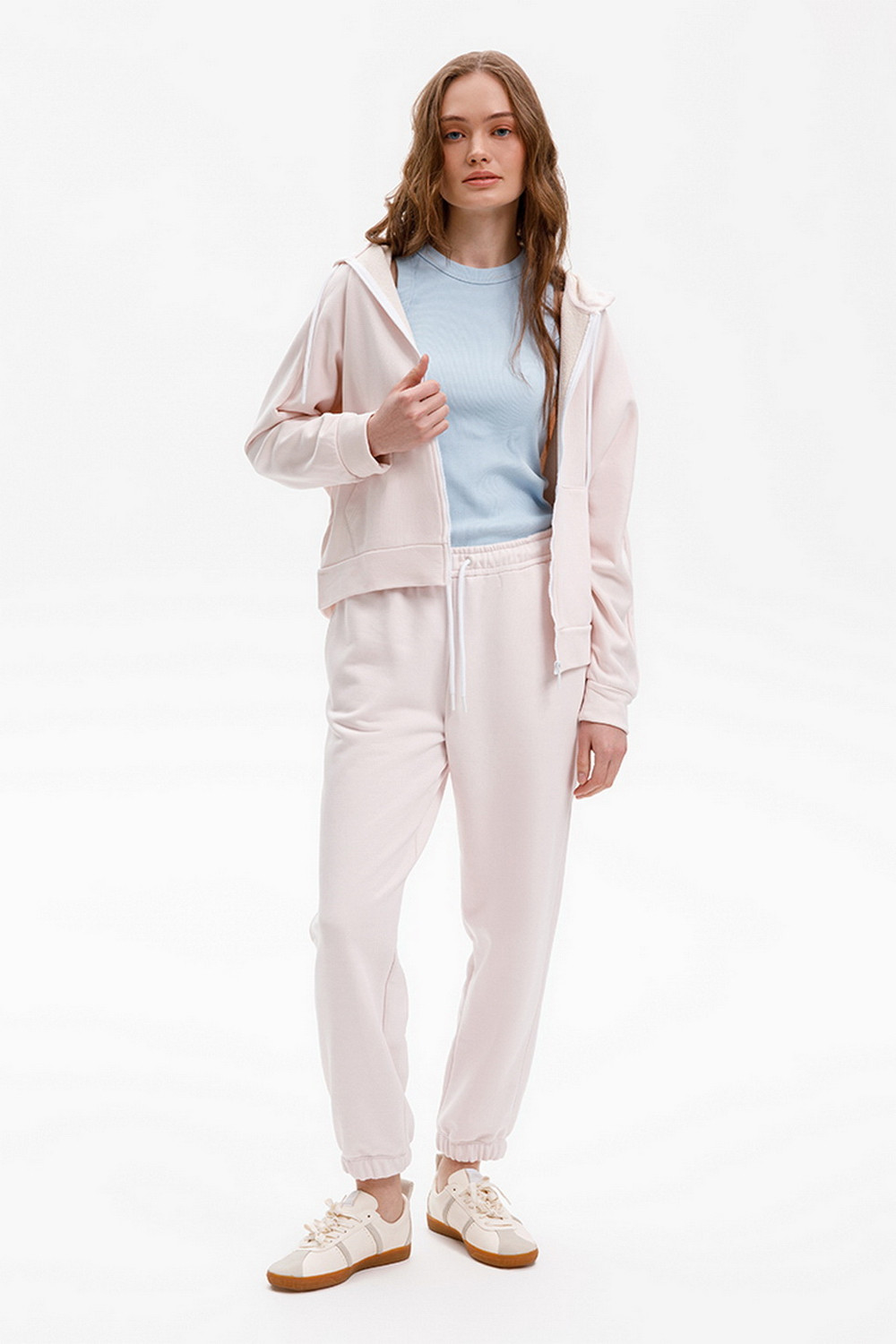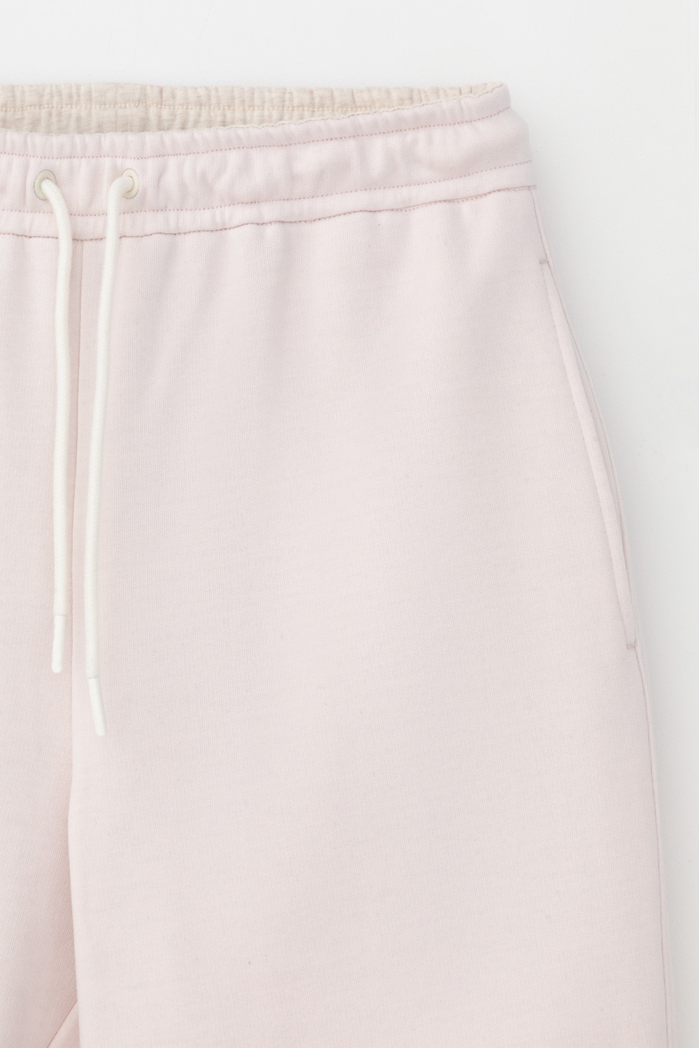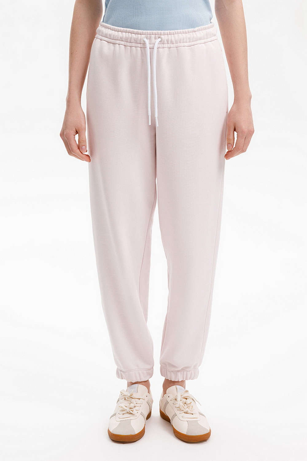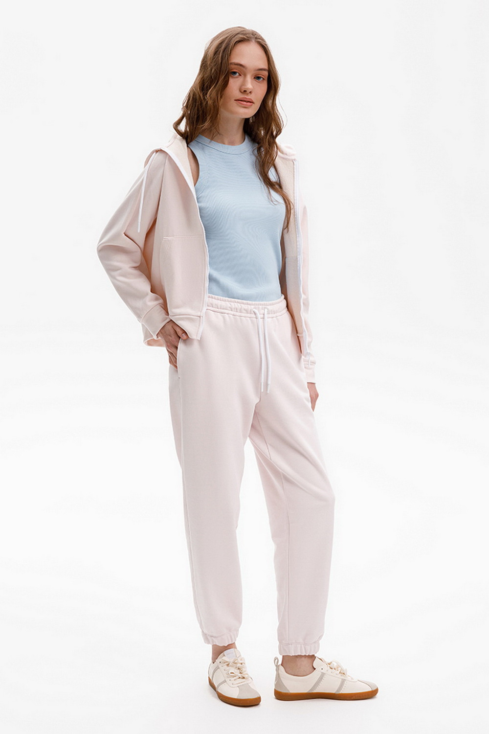 Брюки из мягкого двухцветного футера. Внутренняя сторона изделия представлена в натуральном цвете хлопка, внешняя в нежно-розовом. За счет использования крашенной пряжи, данный вид полотна прошел минимальную обработку, что придало изделию мягкость и шелковистость.