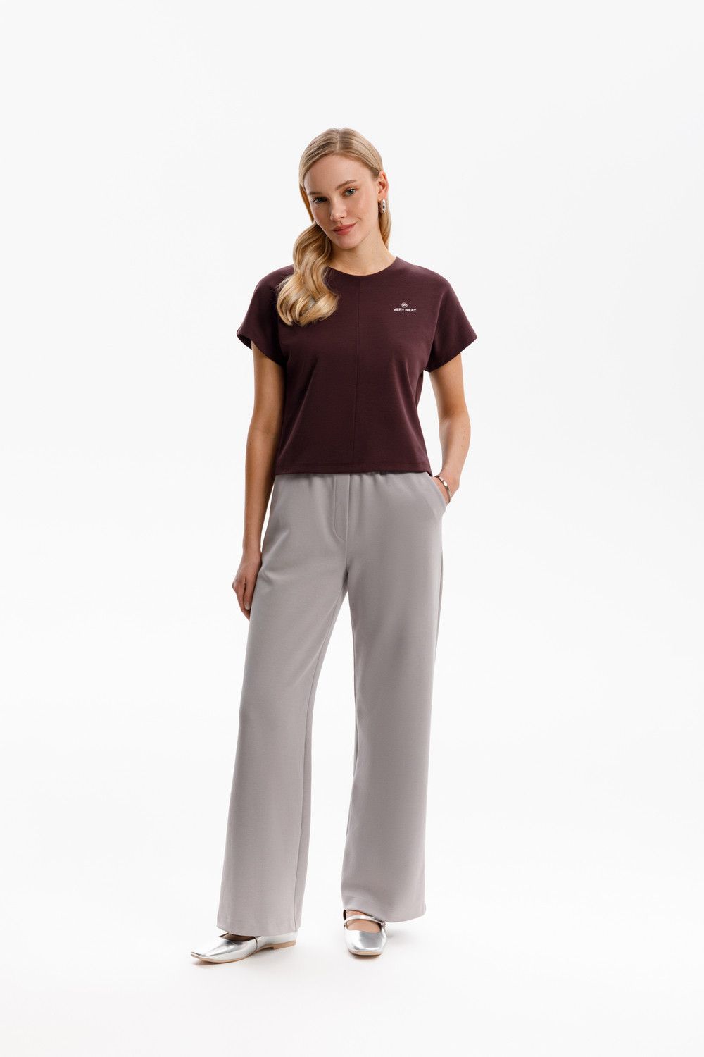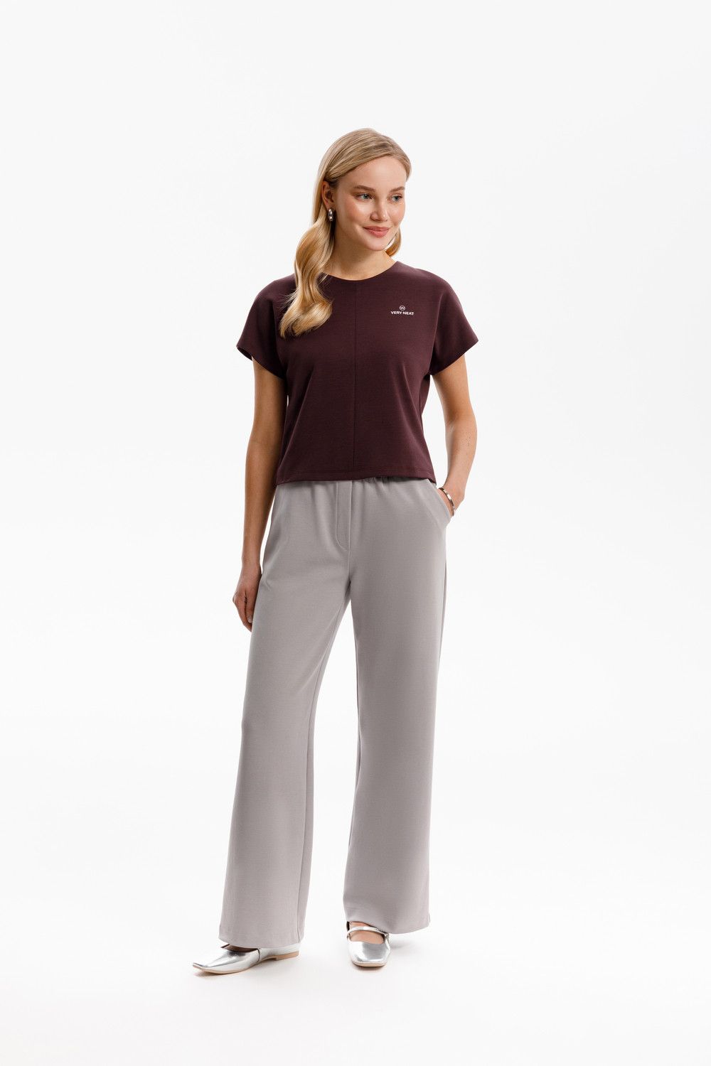 Трикотажные брюки пепельного оттенка создают расслабленный образ за счет прямого кроя и пояса с эластичной тесьмой. Изделие выполнено из премиального трикотажа DOUBLE FACE.