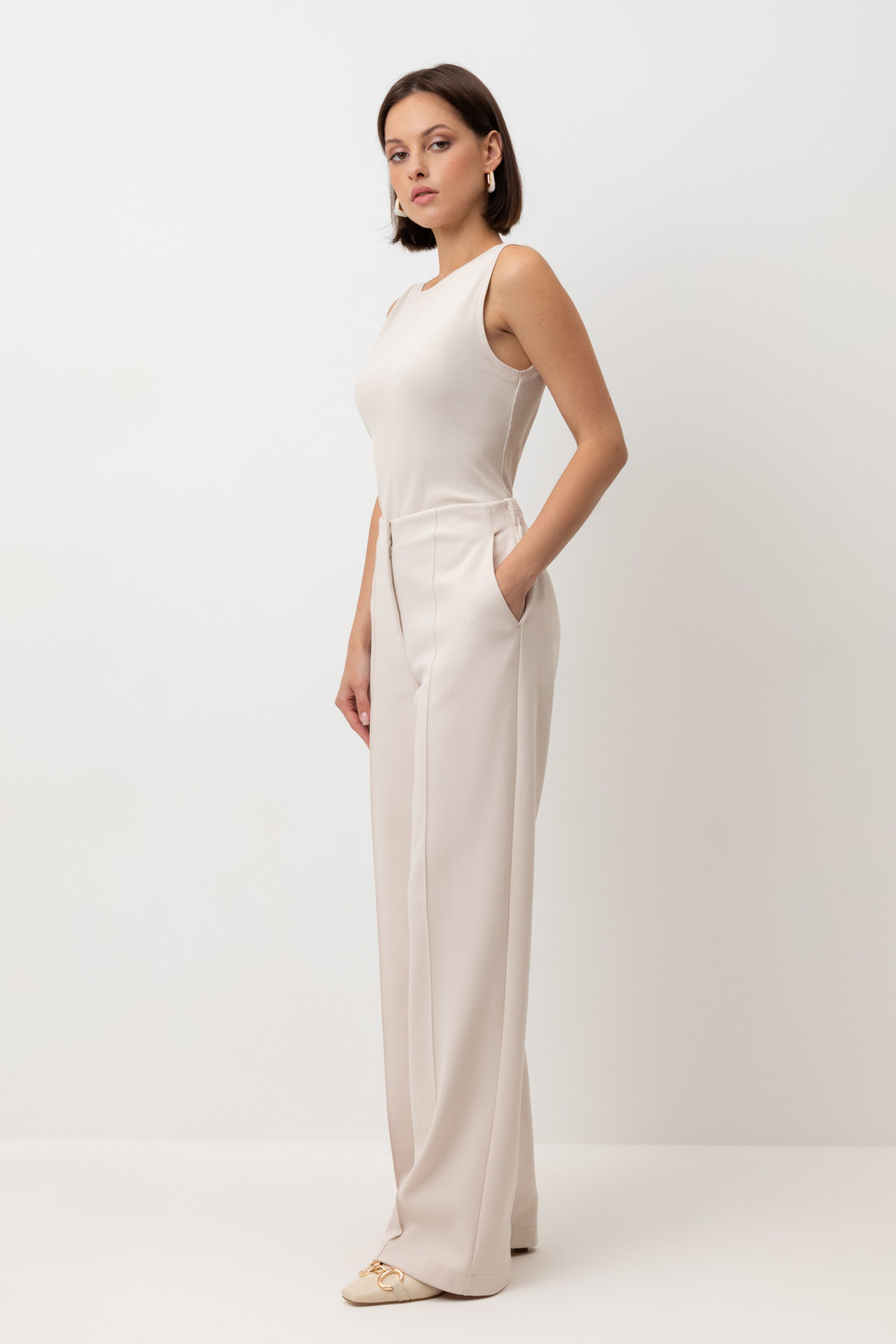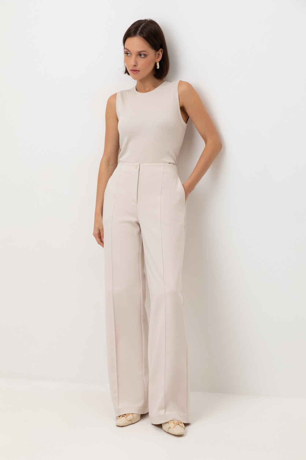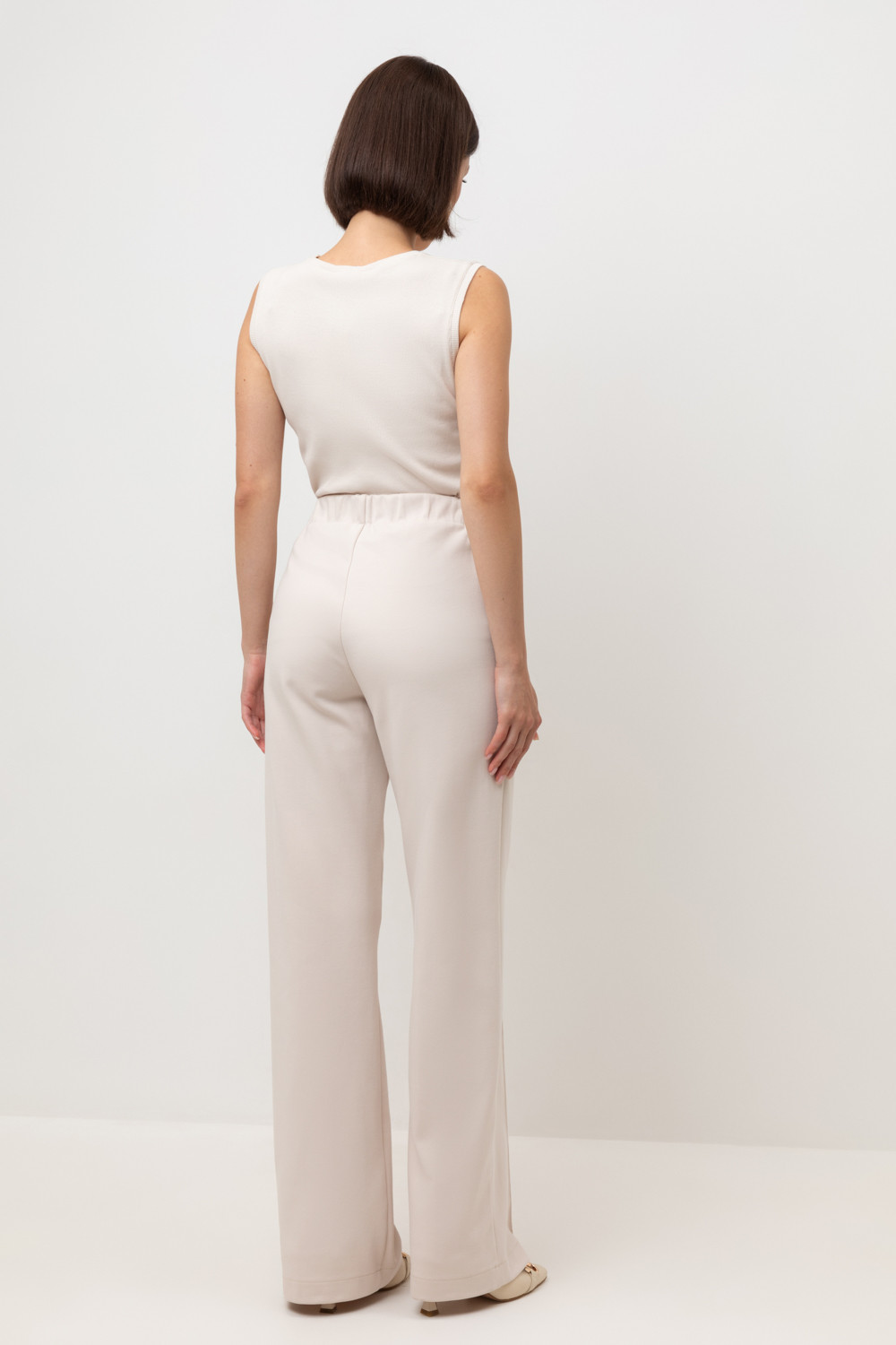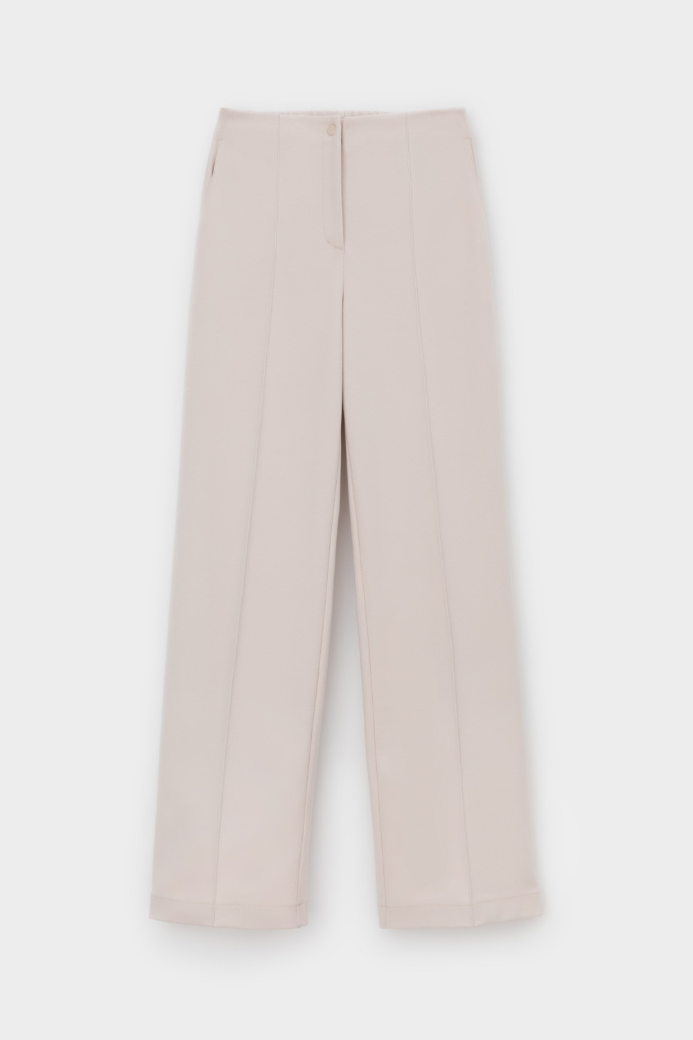 Брюки из премиального трикотажа DOUBLE FACE. Основной акцент в дизайне изделия - стрелки с отстрочкой, создающие эффект длинных ног. Застежка на молнию и дополнительная застежка на кнопку обеспечивают удобную посадку. Натуральный состав трикотажа приятен к телу, что делает его комфортным при носке в любое время года.