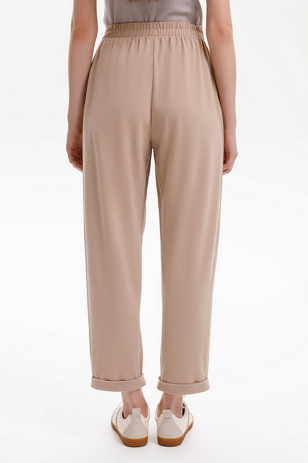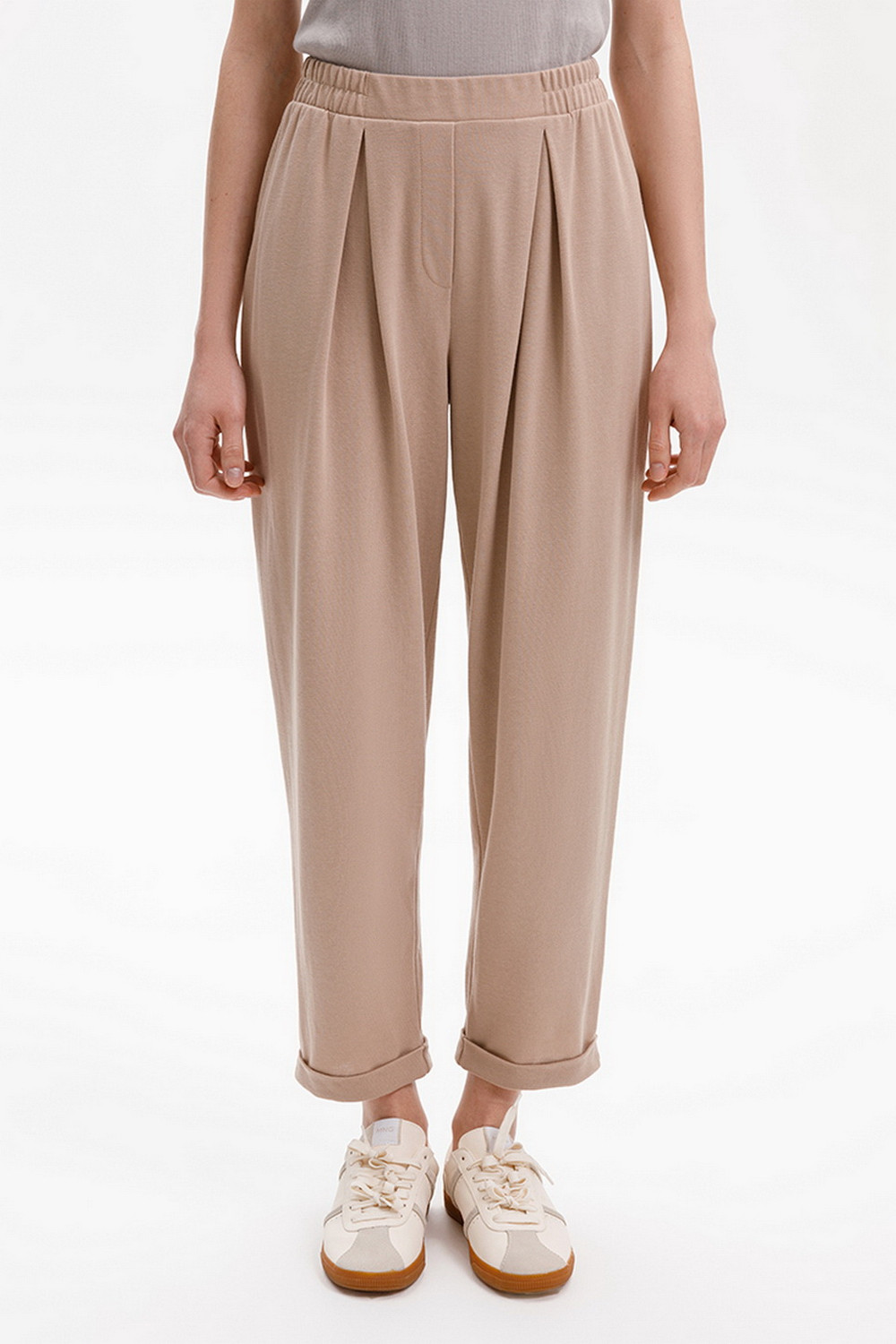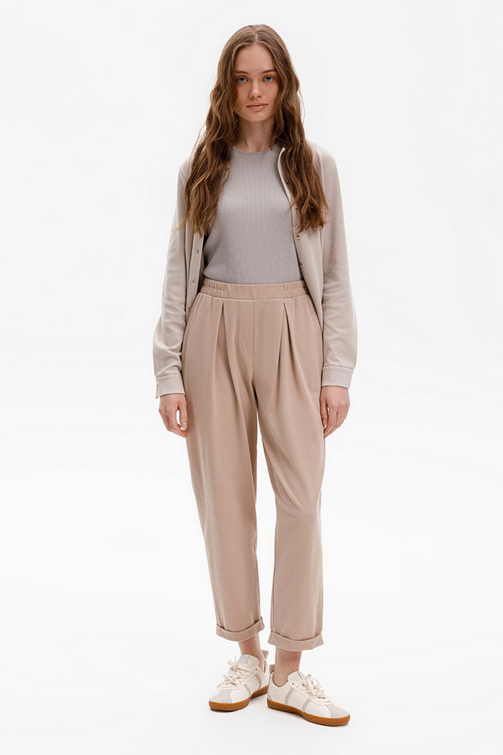 Трикотажные брюки с эластичным поясом, изготовленные из легкого хлопка с рельефной текстурой, дарят ощущение комфорта и легкости. Имитация застежки и складки спереди придают изделию свободный силуэт. В сочетании с рубашкой-поло из этой коллекции, вы создадите стильный образ для теплых летних дней.