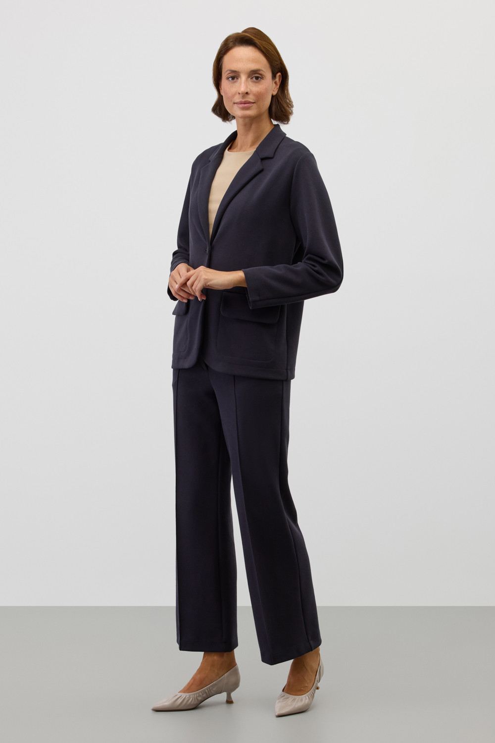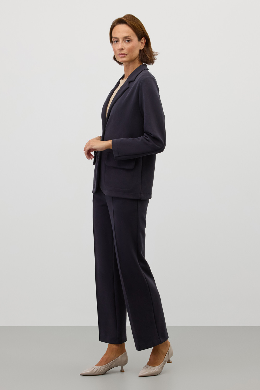 Брюки со стрелкой изготовлены из инновационного трикотажного материала, известного как рибана DOUBLE FACE. Это полотно характеризуется уникальной вязкой, что придает ему исключительную эластичность и мягкость. Современный силуэт и сдержанный дизайн делают их универсальным выбором для самых разных мероприятий — от деловых встреч до непринужденных прогулок по городу.
