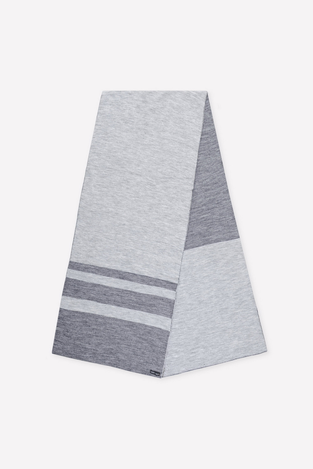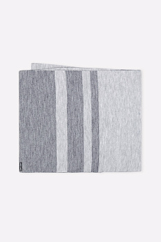Двусторонний шарф из полушерсти с вывязанным рисунком в виде разновеликих полос. Длина - 200 см, ширина - 40 см. Связан гладью. Украшен тиснённым значком из металла и фирменной этикеткой на внутренней стороне.