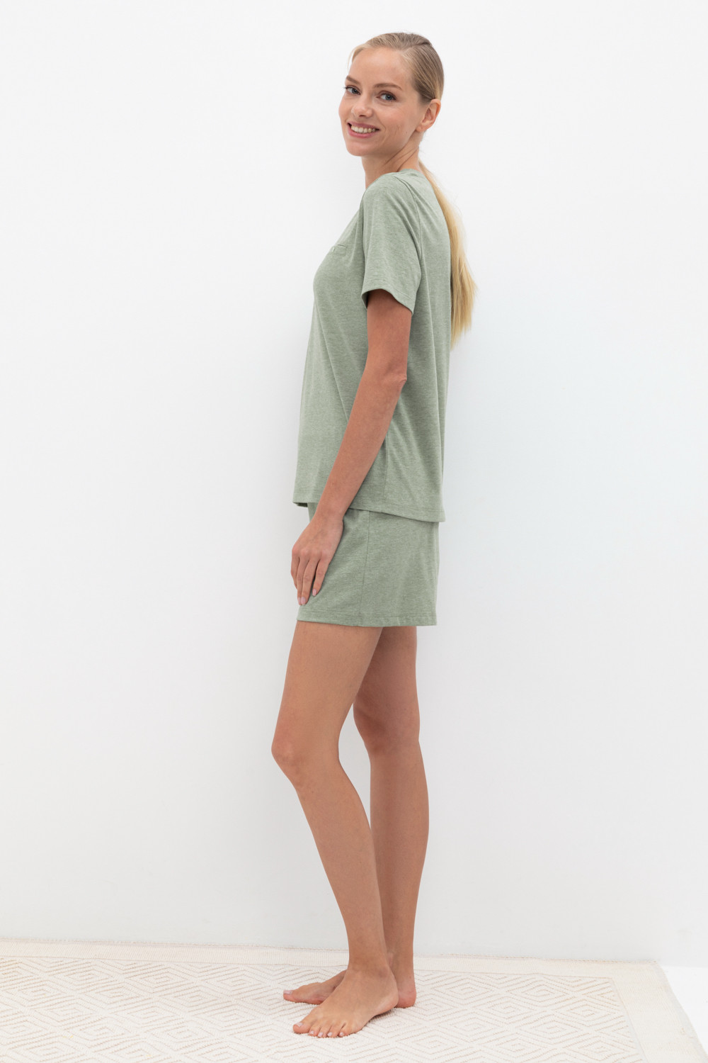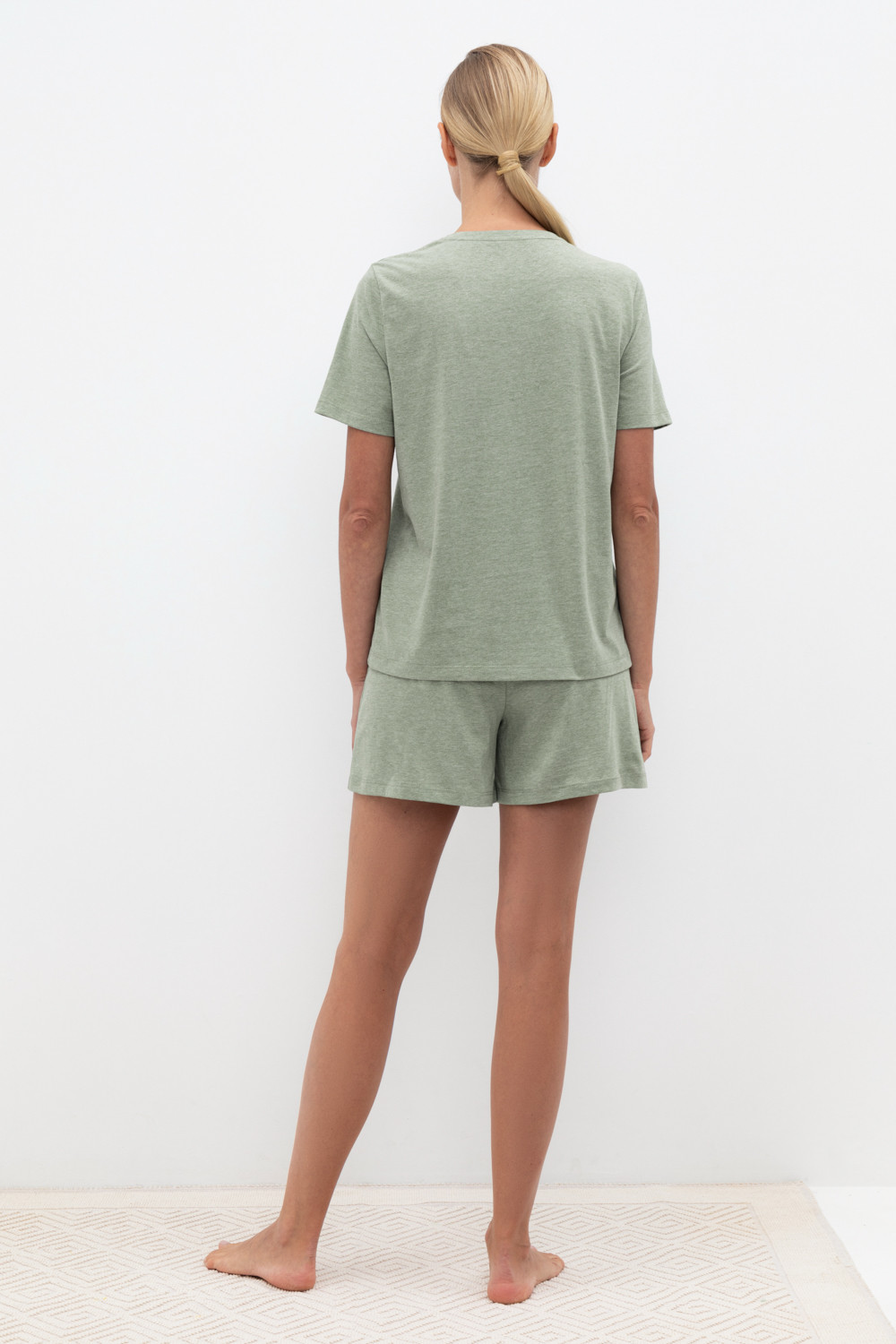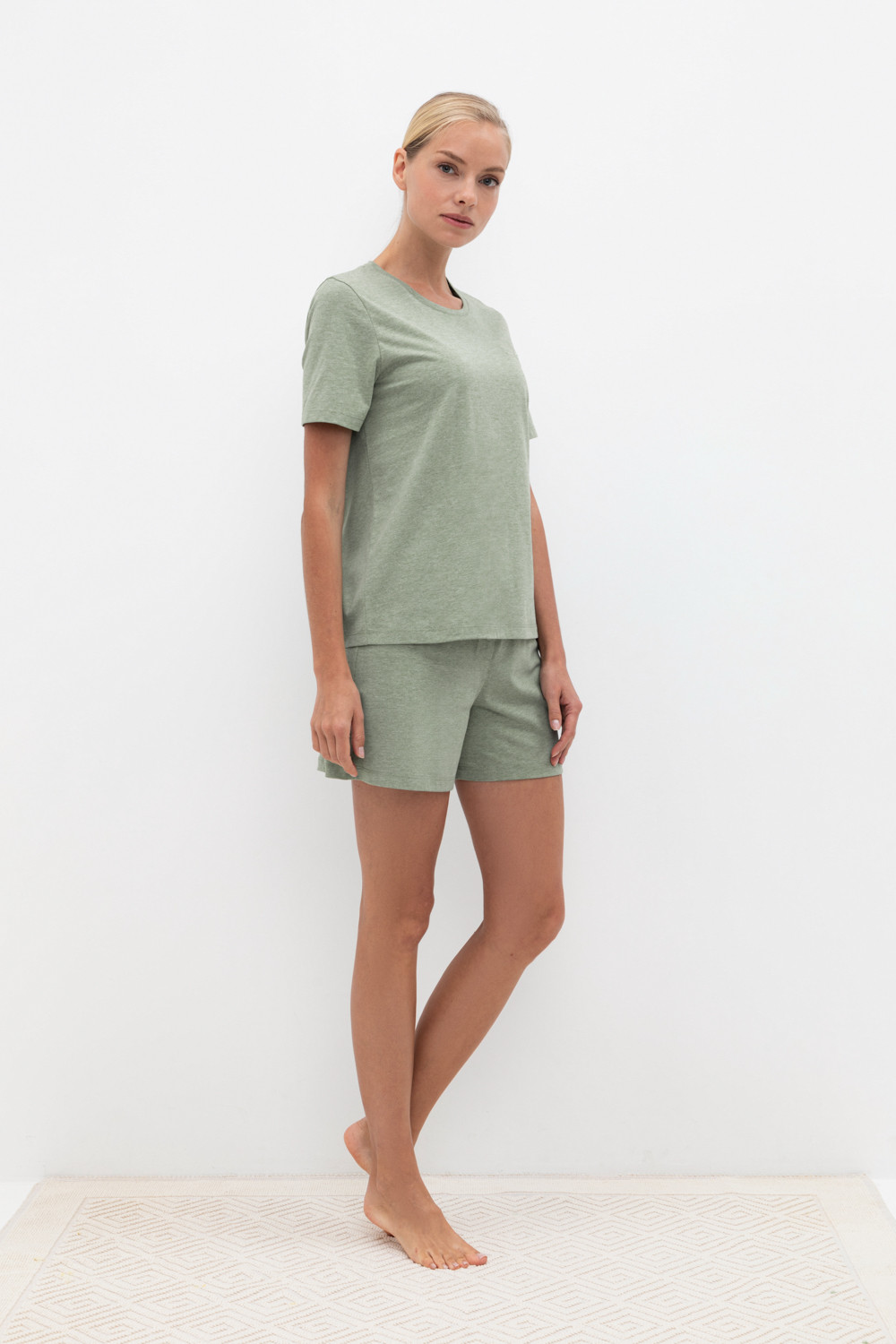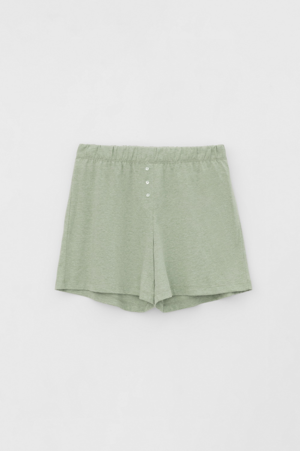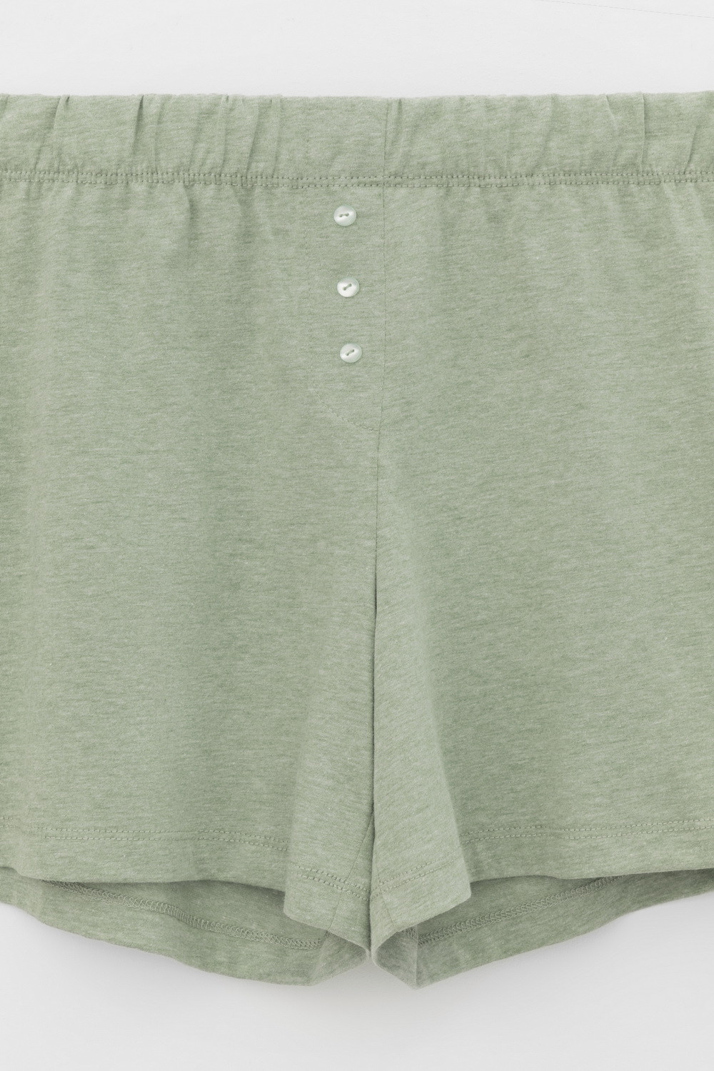 Лёгкие комфортные шорты с мягким поясом на резинке из меланжевого трикотажа и имитацией гульфика с пуговицами.  Гладкий материал приятен к телу, не теряет форму и позволяет коже дышать.