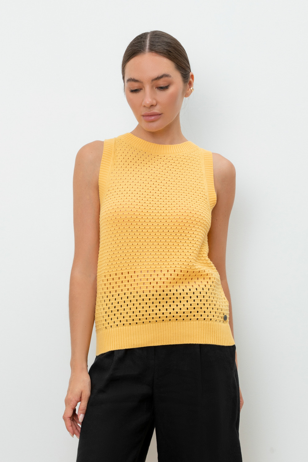 Укороченная вязаная ажурная майка. Состав 68% полиэстер, 32% вискоза.
