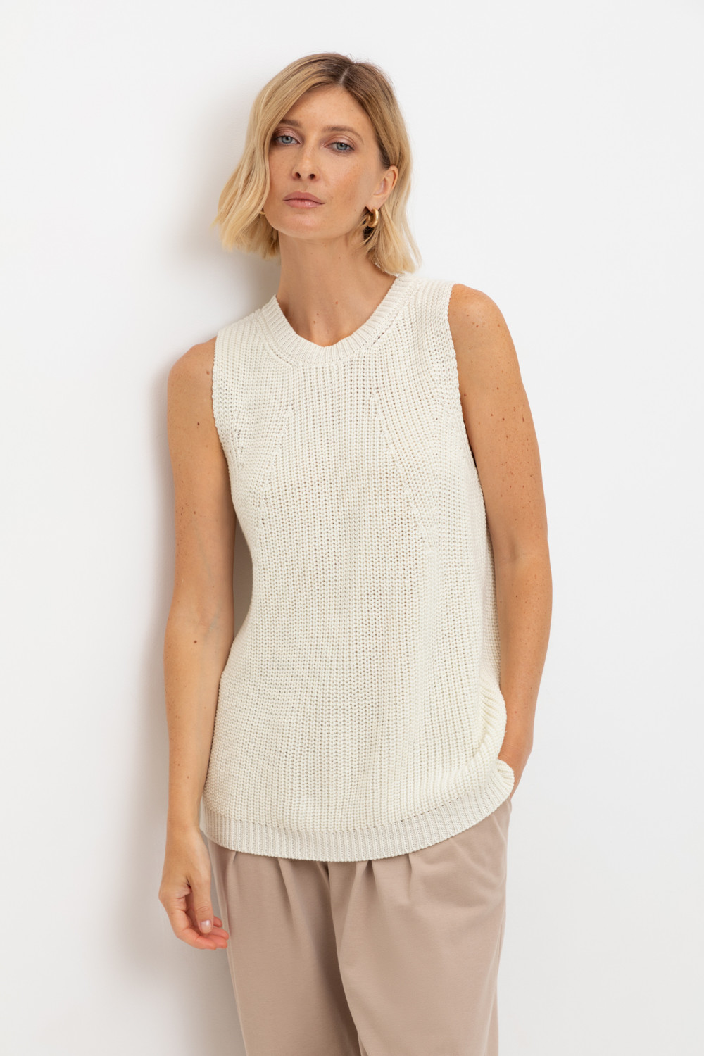 Нежный топ в классическом переплетении нитей молочного цвета выполнен из итальянской хлопковой пряжи. Лаконичный стиль топа позволяет сочетать его в разных образах.