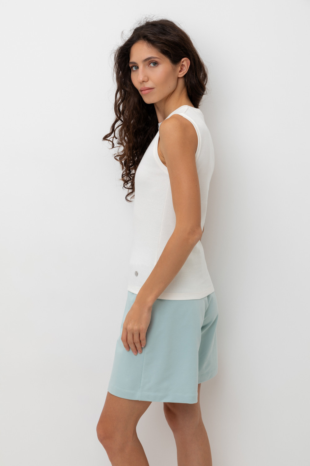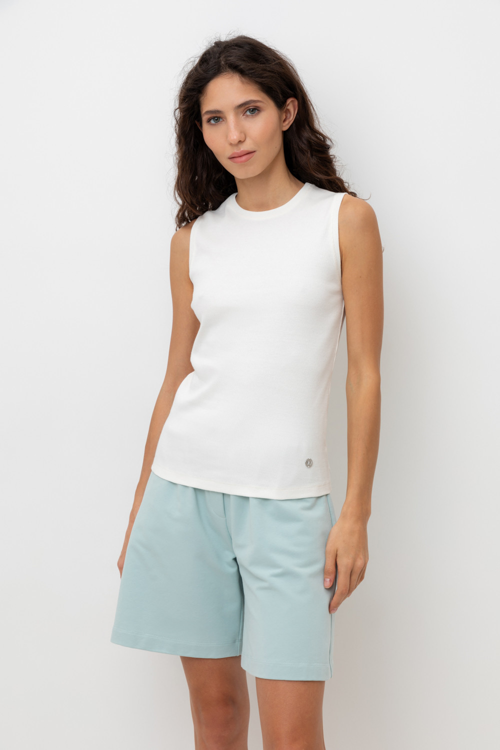 Базовым элементом гардероба является топ из эластичного трикотажа в рубчик. Широкое плечо и высокий вырез делают изделие комфортным и универсальным в носке.
