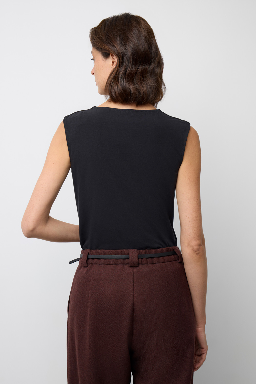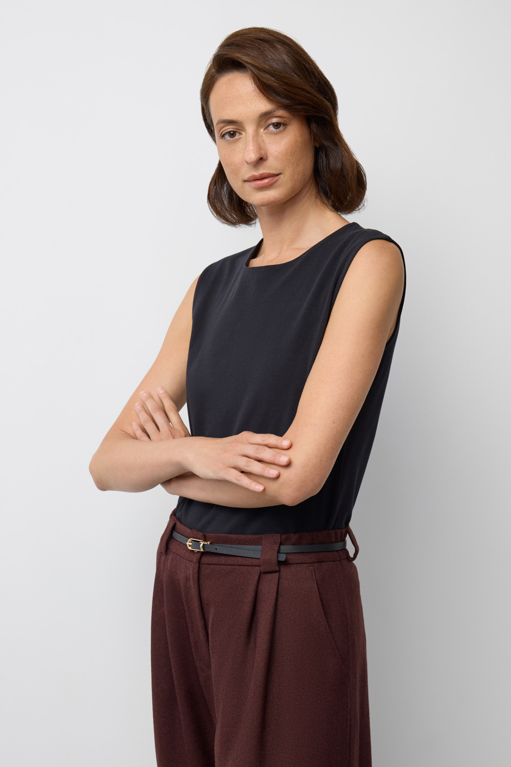 Классическим элементом гардероба является базовый топ из хлопка. Широкие бретели делают изделие комфортным в носке и универсальным в повседневной жизни.