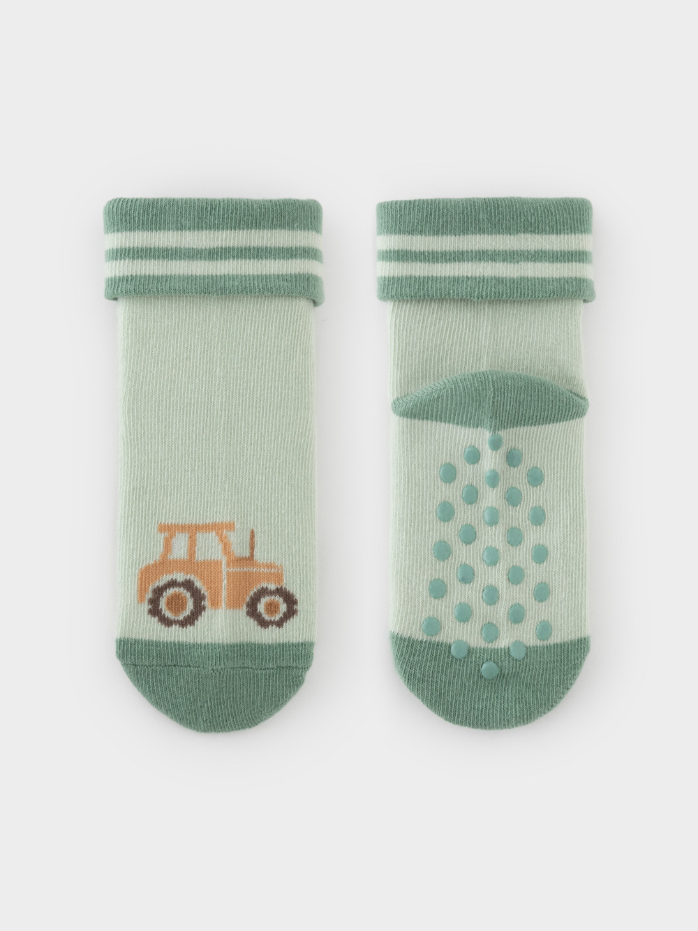 Носки детские с формованной пяткой и отворотом. Украшены рисунком. На стопе противоскользящие стопперы. Изделие сохраняет форму и стойкий цвет после многочисленных стирок.