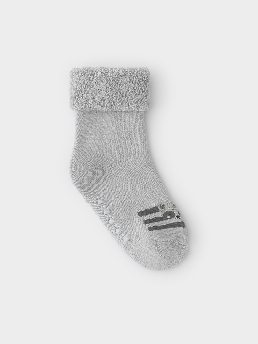 Носки махровые с формованной пяткой и отворотом по краю. На подошве резиновые стопперы. Украшены рисунком. Изделие сохраняет форму и стойкий цвет после многочисленных стирок.