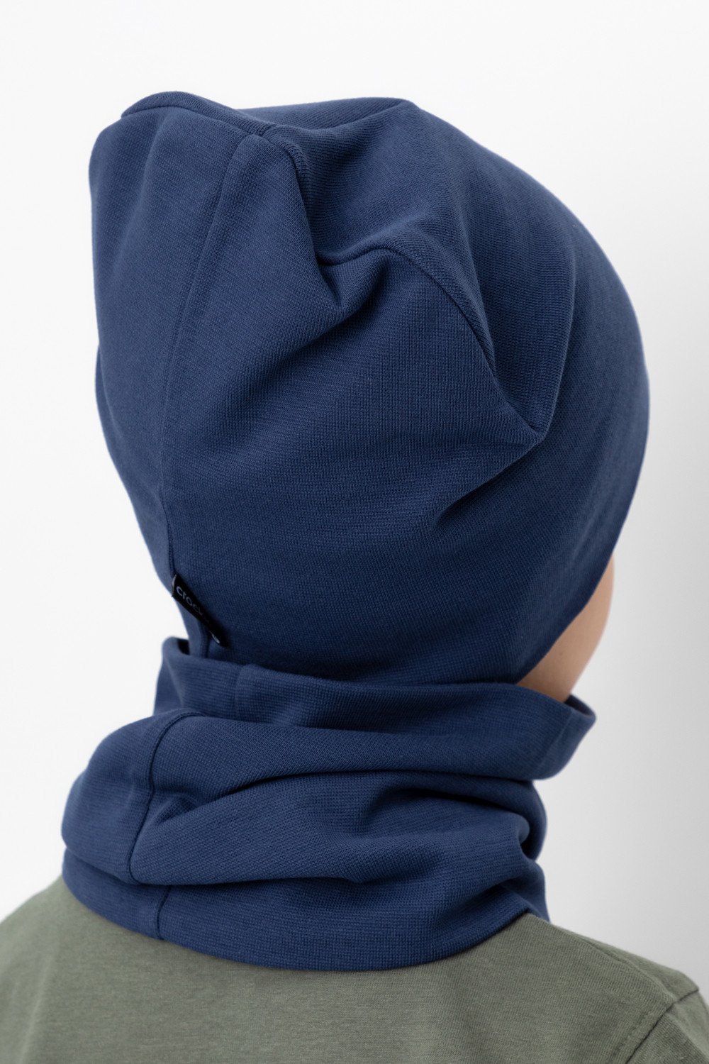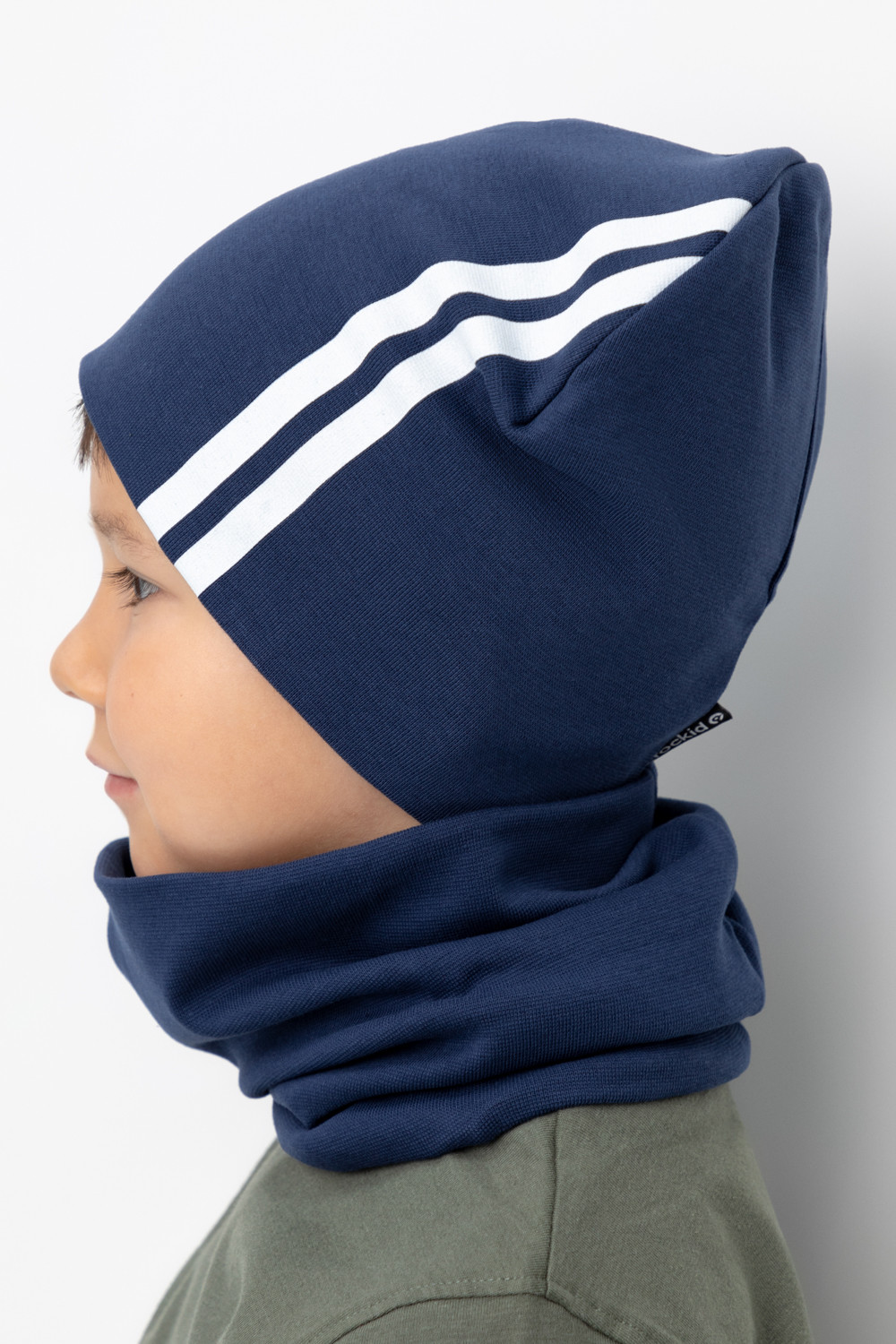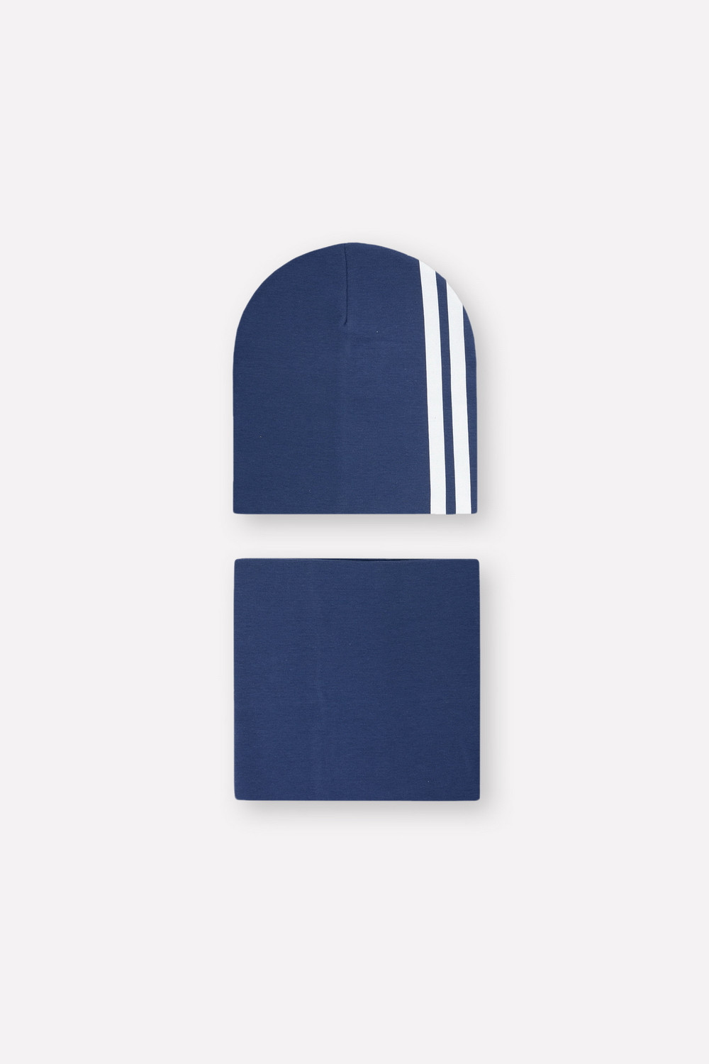 Комплект для мальчика - шапка и снуд из трикотажа рибана с эластаном. Шапка с удлинённой скругленной макушкой. Снуд сплошной. Украшены принтом со спортивными полосками.
