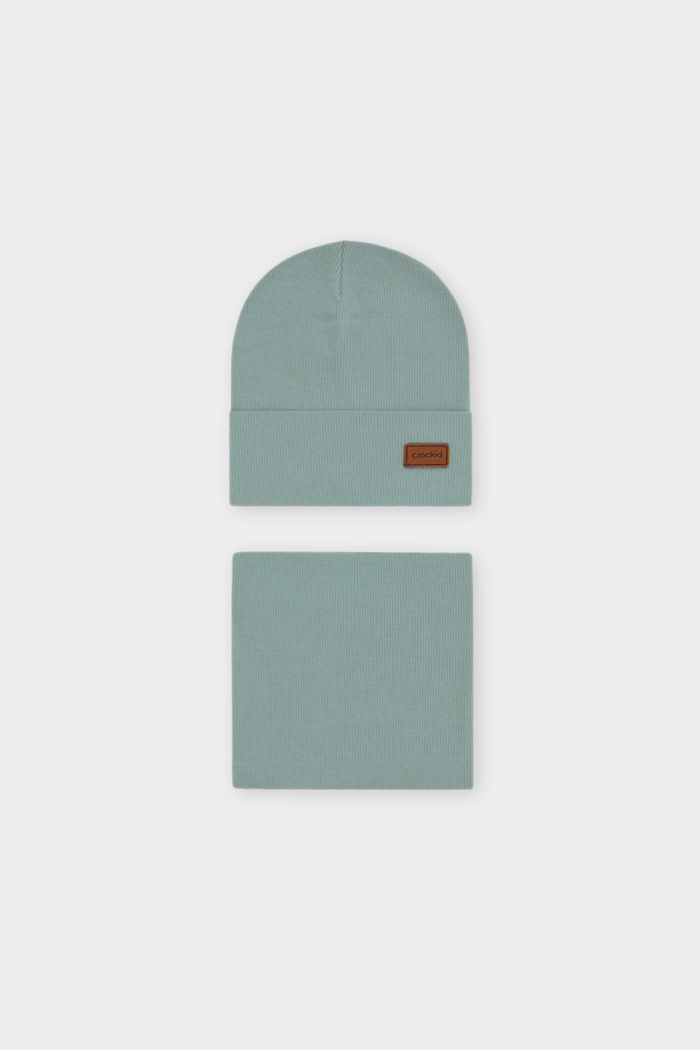 Комплект для мальчика: шапка и снуд из хлопкового трикотажа в рубчик с добавлением эластана, окрашенного стойкими гипоаллергенными текстильными красителями. Изделия хорошо тянутся, после многократных стирок сохраняют цвет и форму.