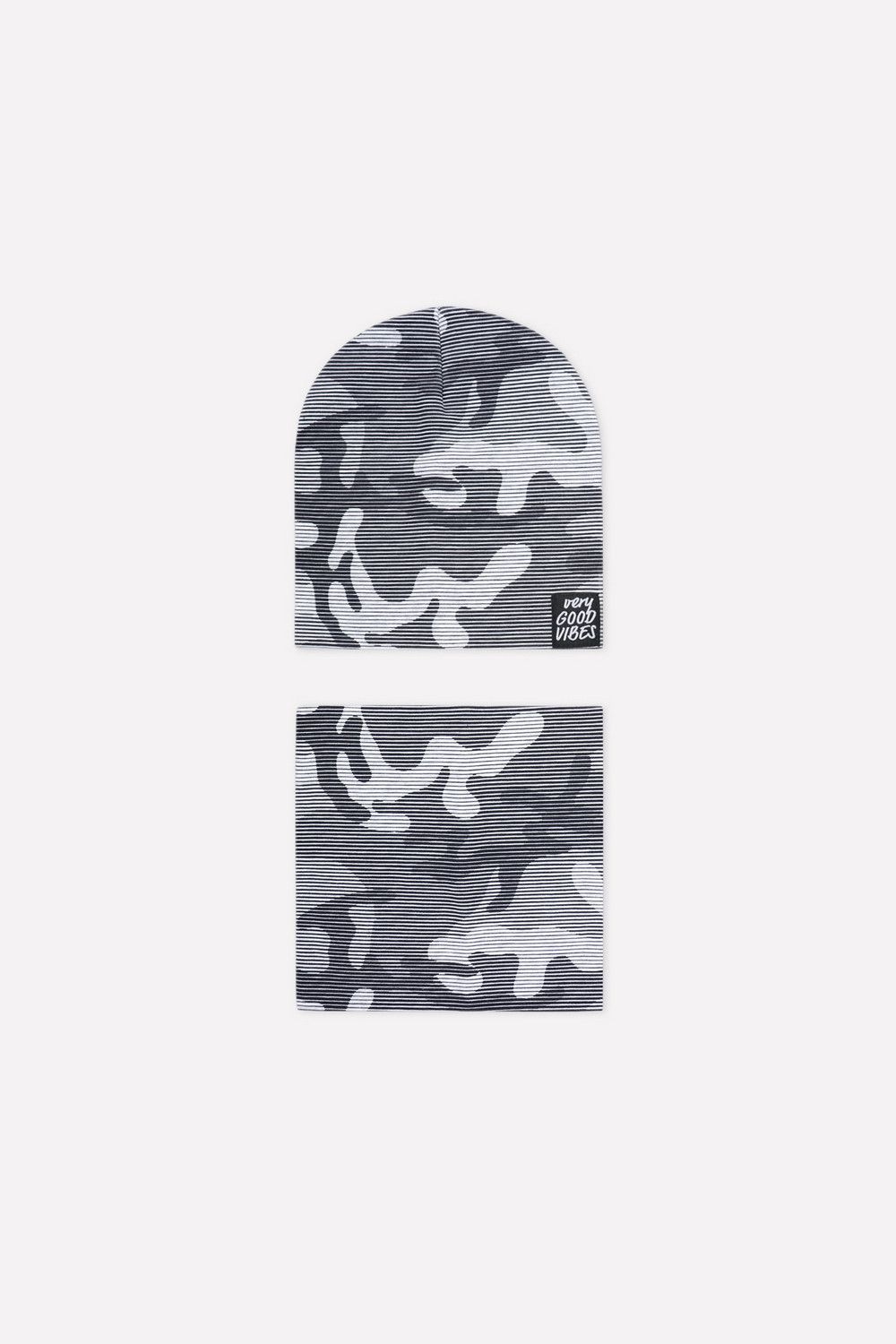 Комплект для мальчика - шапка и снуд из трикотажа рибана с эластаном. Шапка с удлинённой скругленной макушкой. Снуд сплошной. Украшены набивным рисунком и жаккардовой нашивкой.