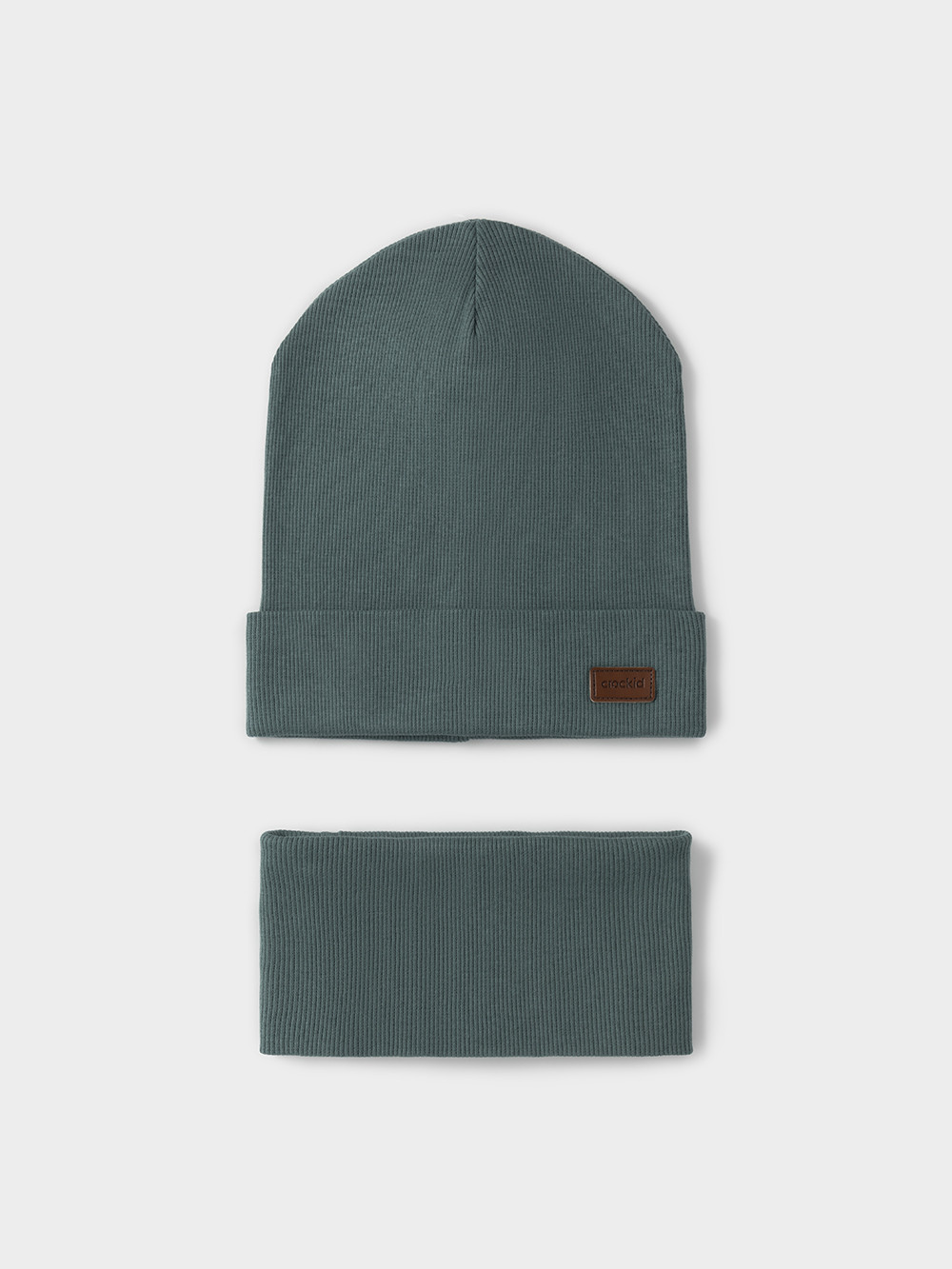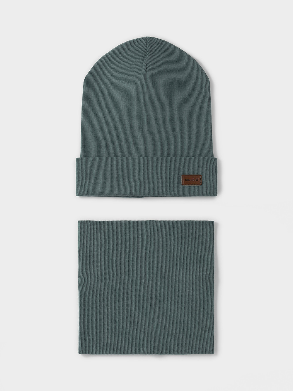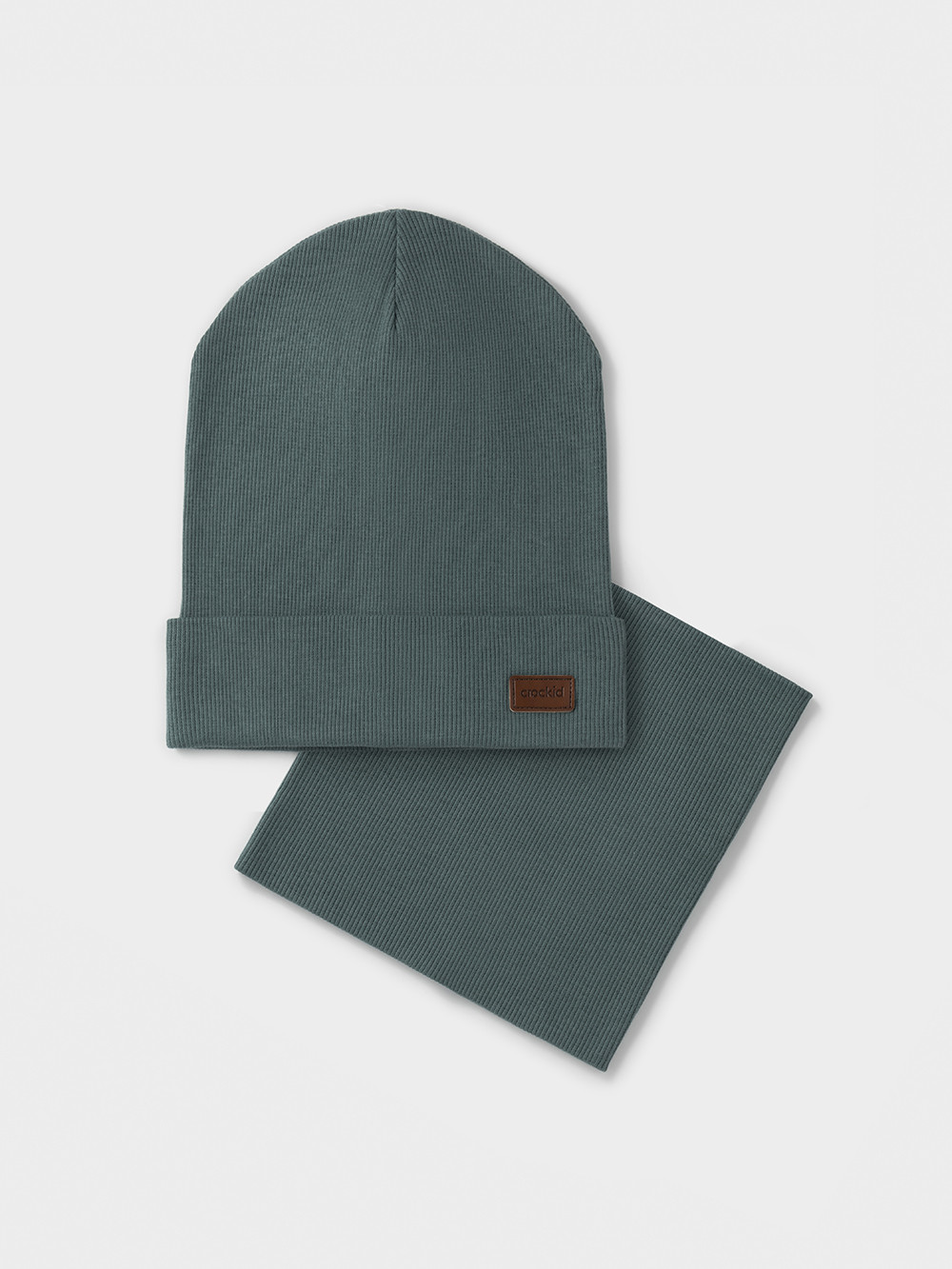 Комплект для мальчика: шапка и снуд. Изготовлен из хлопкового трикотажа в рубчик с добавлением спандекса. Комфортно прилегает, обеспечивая защиту от холода и хороший теплообмен.  Изделия хорошо тянутся, после многократных стирок сохраняют цвет и форму.