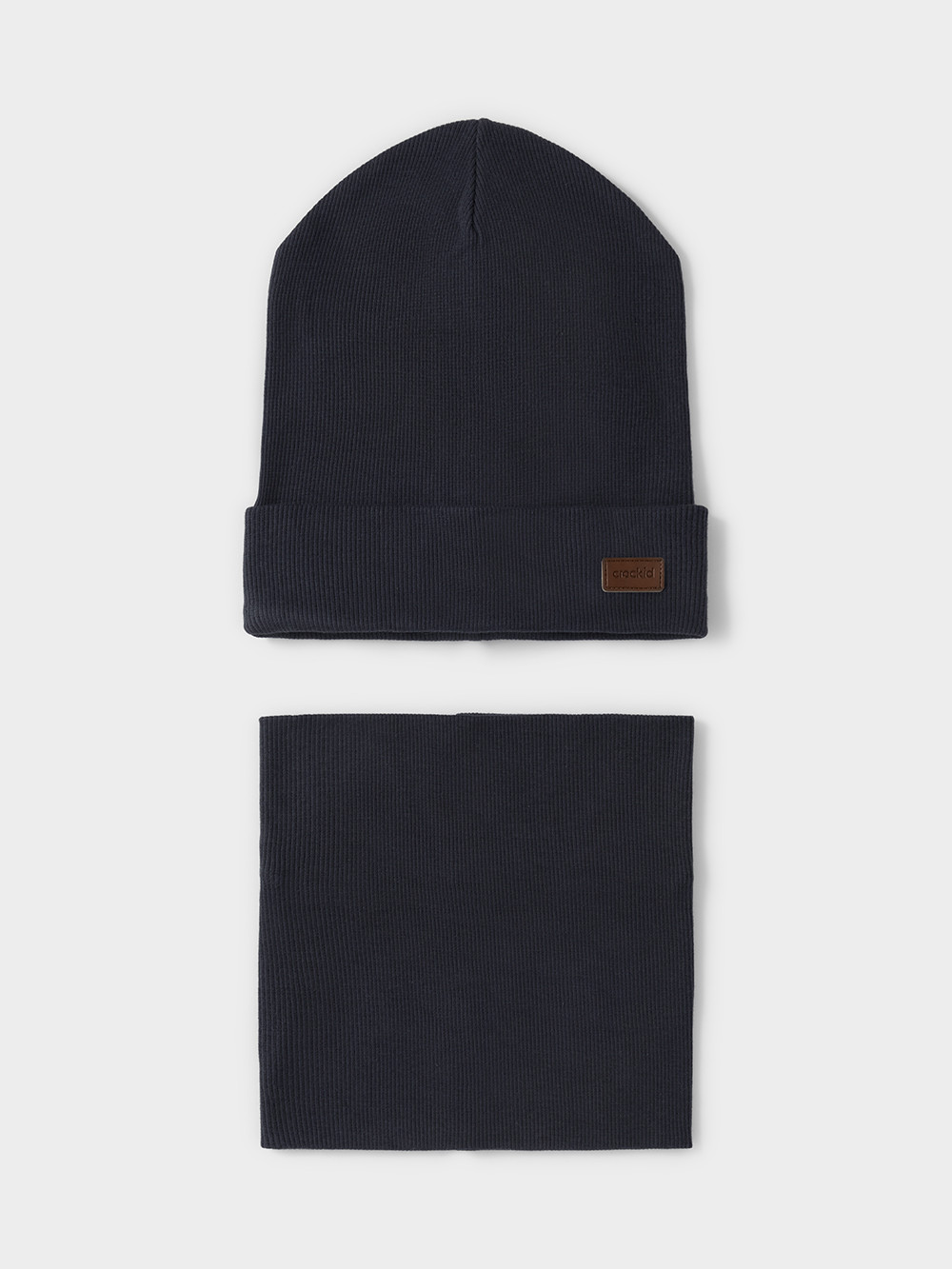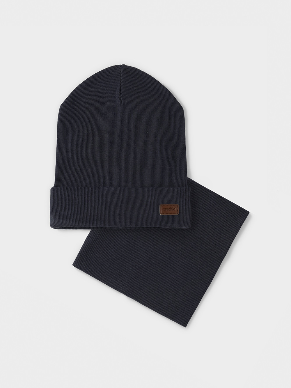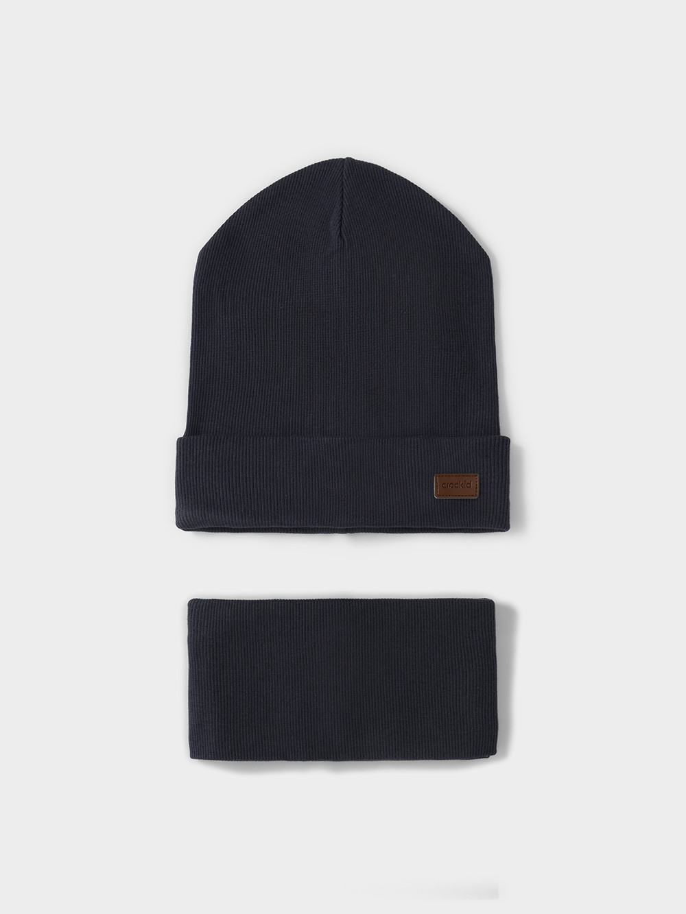 Комплект для мальчика: шапка и снуд. Изготовлен из хлопкового трикотажа в рубчик с добавлением спандекса. Комфортно прилегает, обеспечивая защиту от холода и хороший теплообмен.  Изделия хорошо тянутся, после многократных стирок сохраняют цвет и форму.