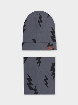 Комплект для мальчика: шапка и снуд. Изготовлен из хлопкового трикотажа в рубчик с добавлением спандекса. Комфортно прилегает, обеспечивая защиту от холода и хороший теплообмен.  Изделия хорошо тянутся, после многократных стирок сохраняют цвет и форму.
