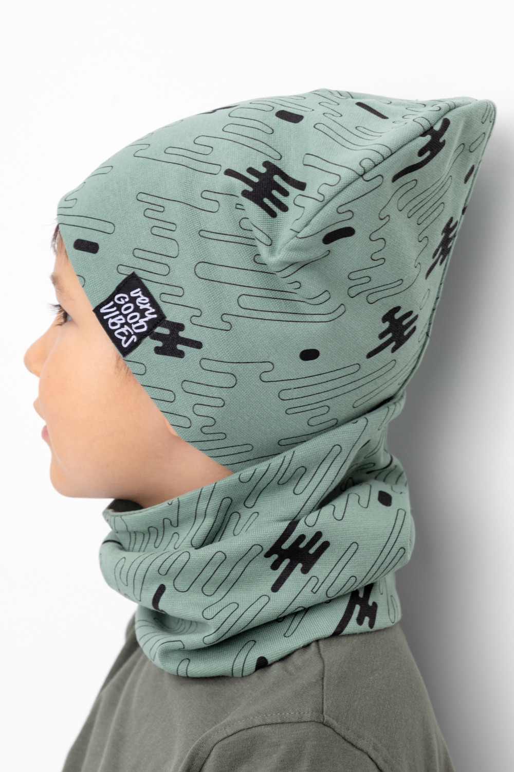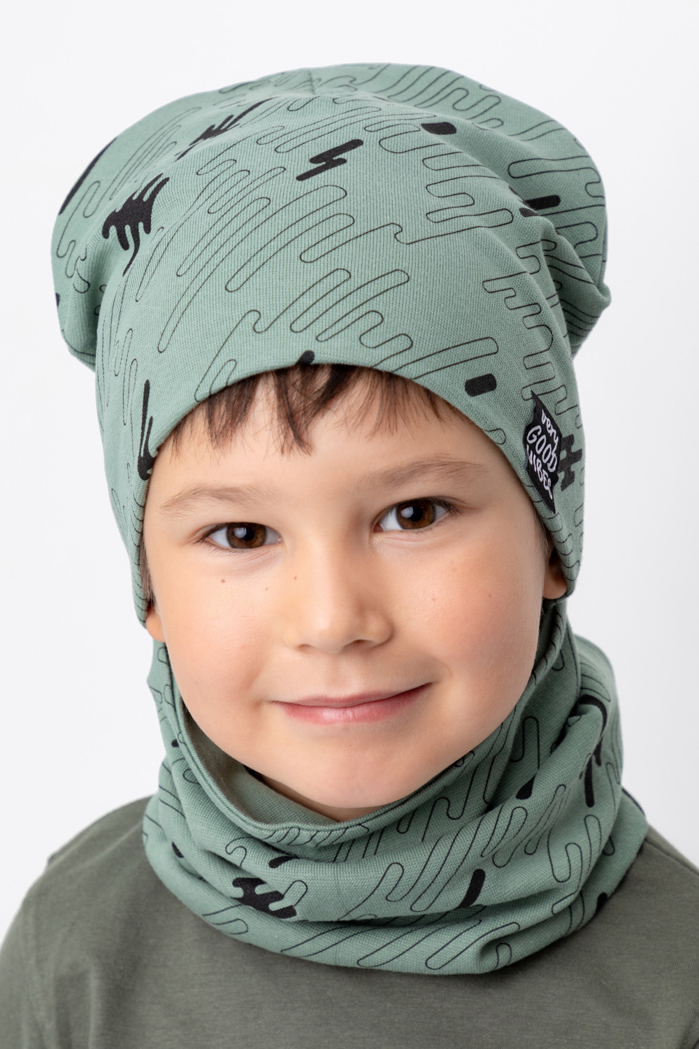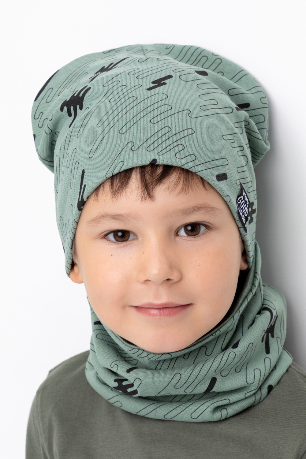 Комплект для мальчика - шапка и снуд из набивного трикотажа рибана с эластаном. Шапка с удлинённой скругленной макушкой, украшена жаккардовой нашивкой. Снуд сплошной.