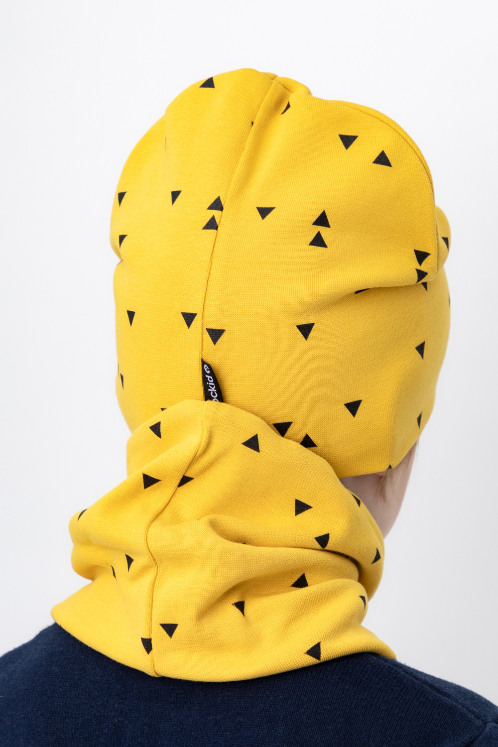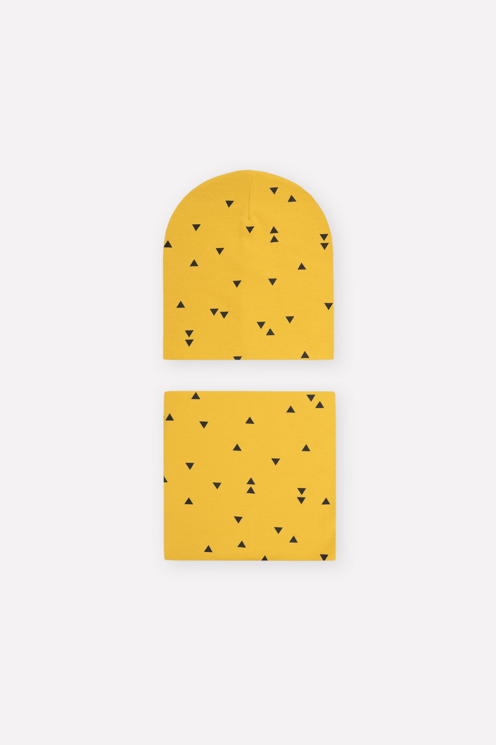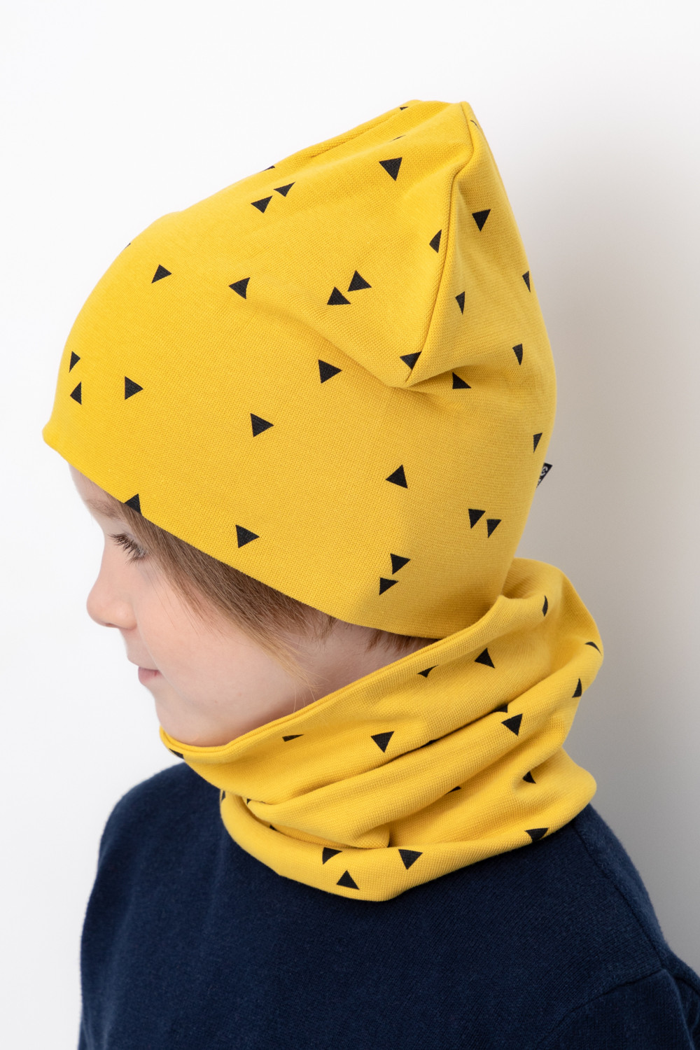 Комплект для мальчика - шапка и снуд из трикотажа рибана с эластаном. Шапка с удлинённой скругленной макушкой. Снуд сплошной. Украшены набивным рисунком с изображением треугольников.
