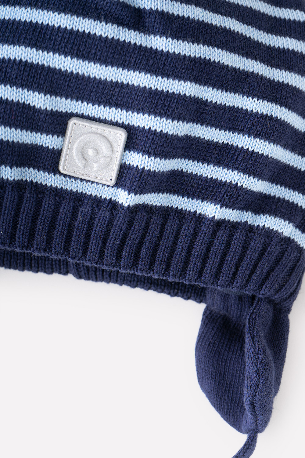 Шапка из хлопковой пряжи на завязках с мягким трикотажным подкладом из интерлока. На передней части шапочки пришит светоотражатель. Украшена вывязанным узором в полоску.