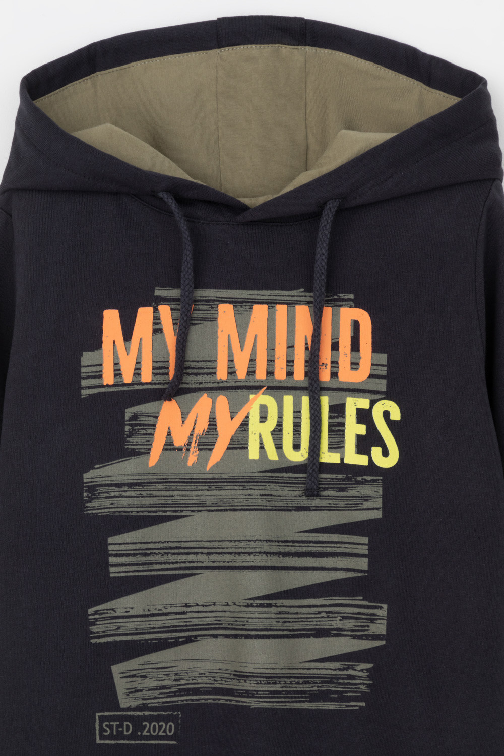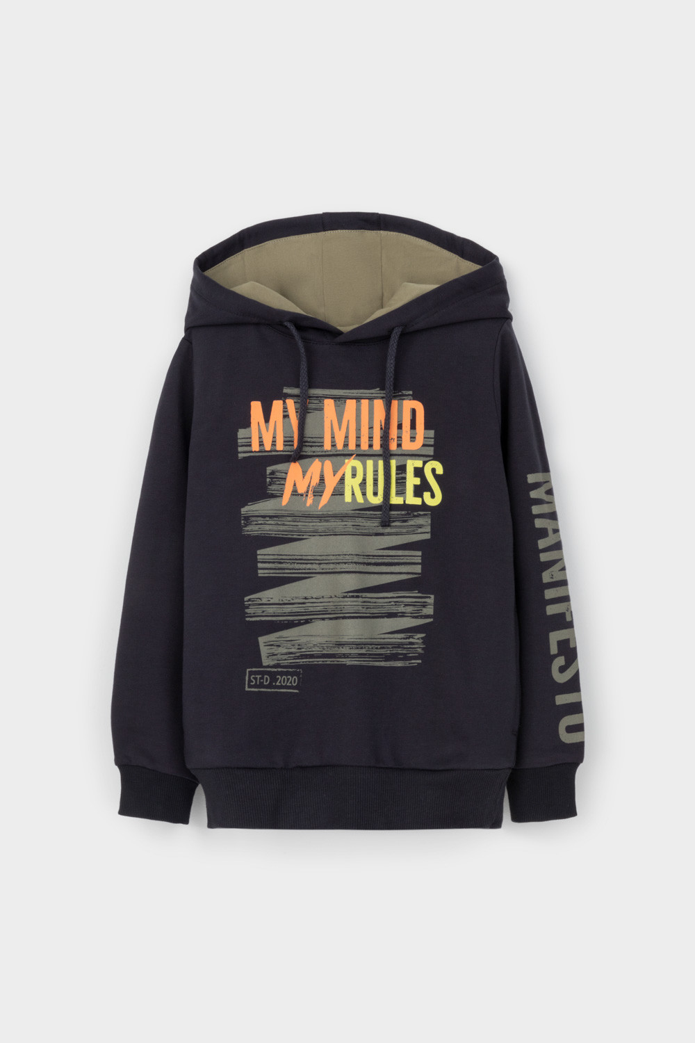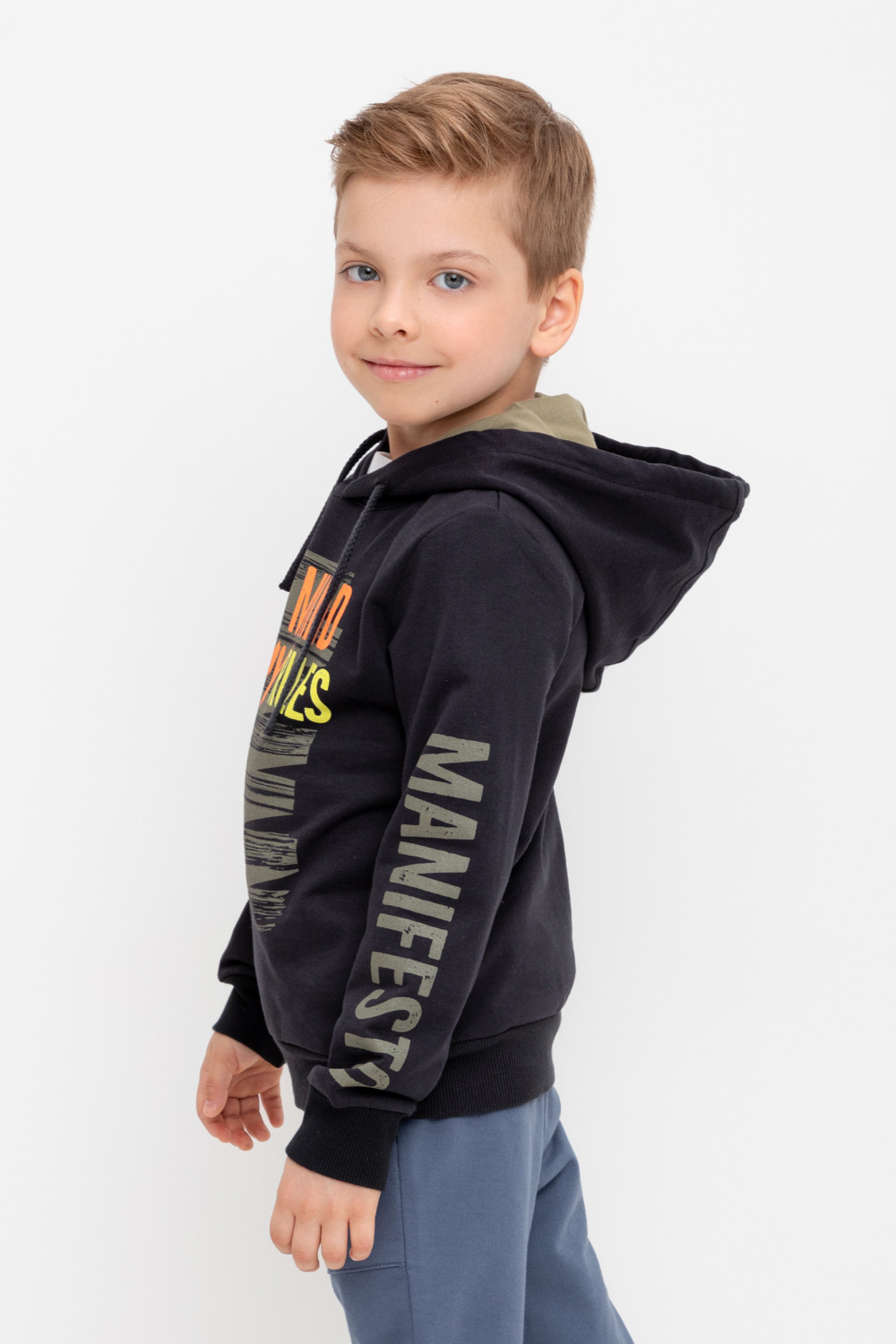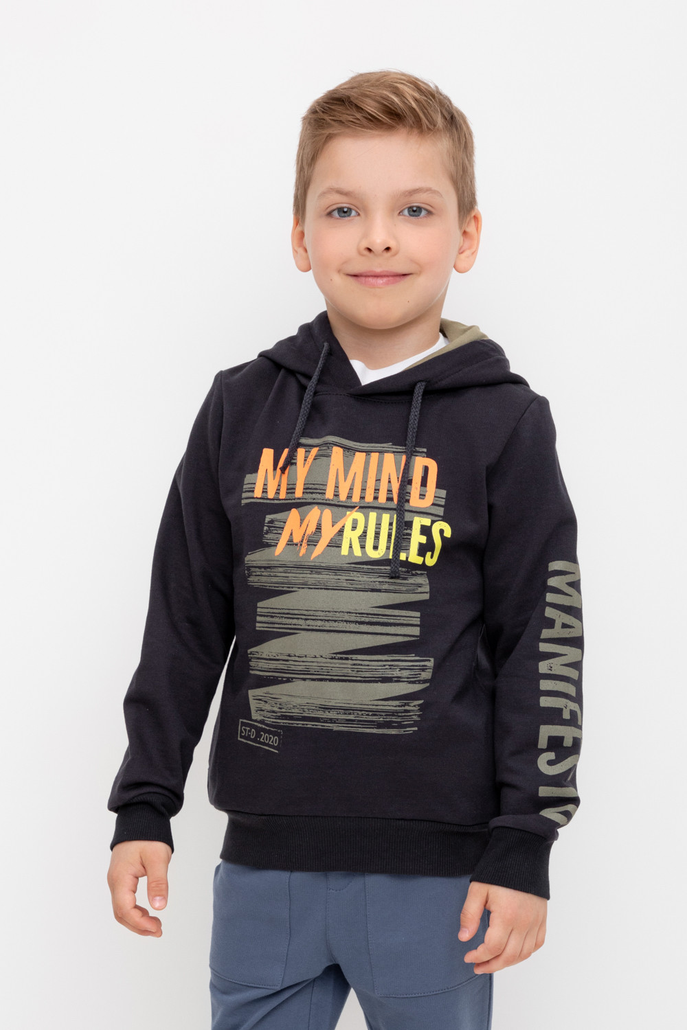 Толстовка с капюшоном для мальчика из однотонного петельчатого футера. Манжеты и пояс из эластичного трикотажа в рубчик. Спереди принт.