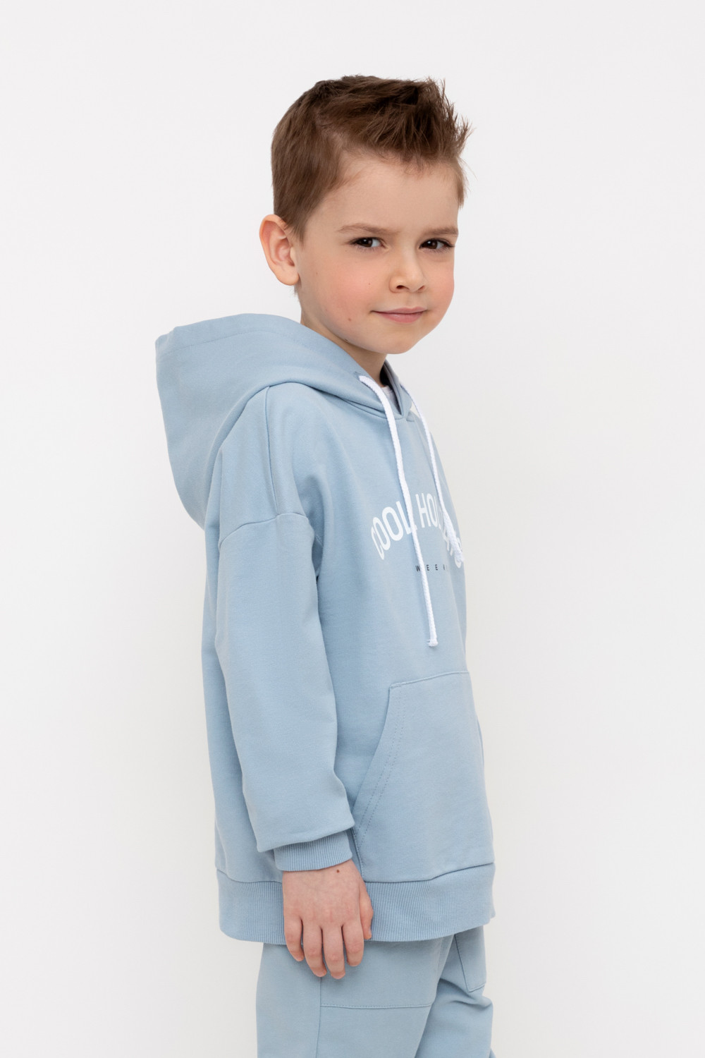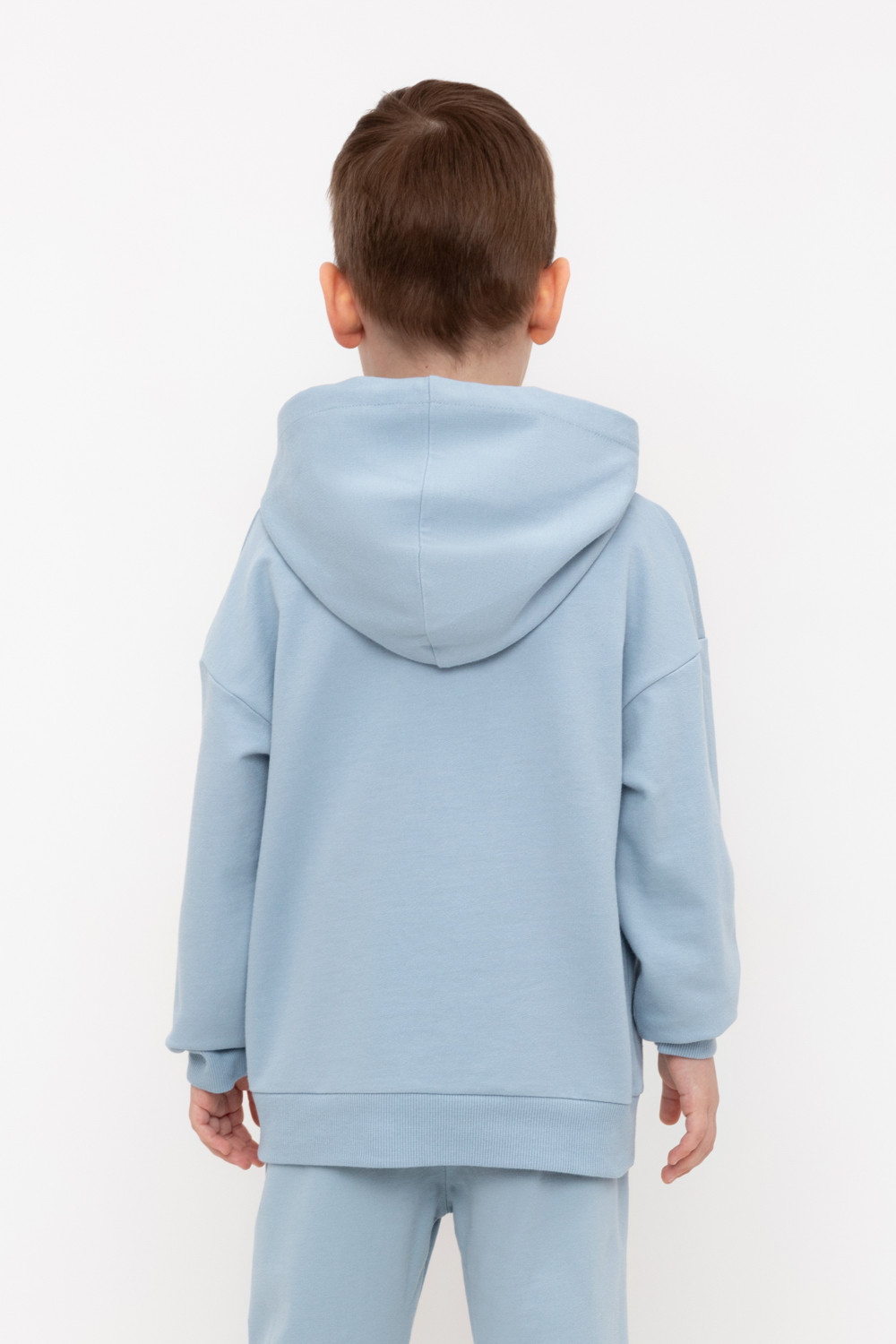 Худи с капюшоном для мальчика из петельчатого футера. Манжеты и пояс выполнены из эластичного полотна. Спереди удобный карман-кенгуру.