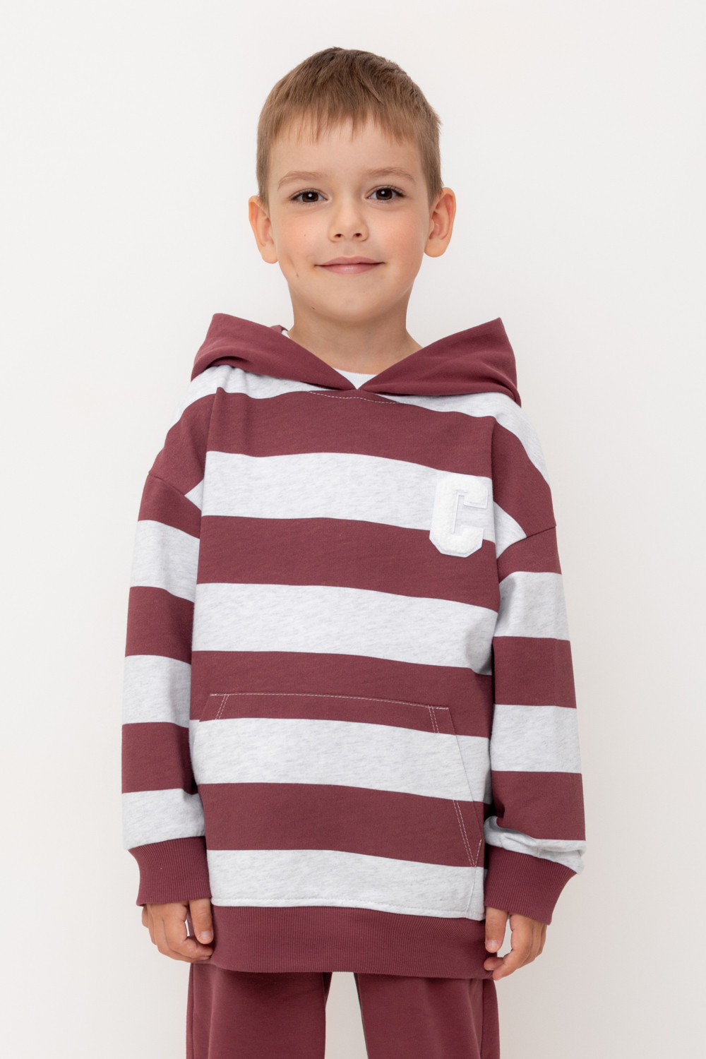 Трикотажное худи с капюшоном из набивного петельчатого футера. Спереди удобный накладной карман-кенгуру. Манжеты и пояс из эластичного трикотажа в рубчик.