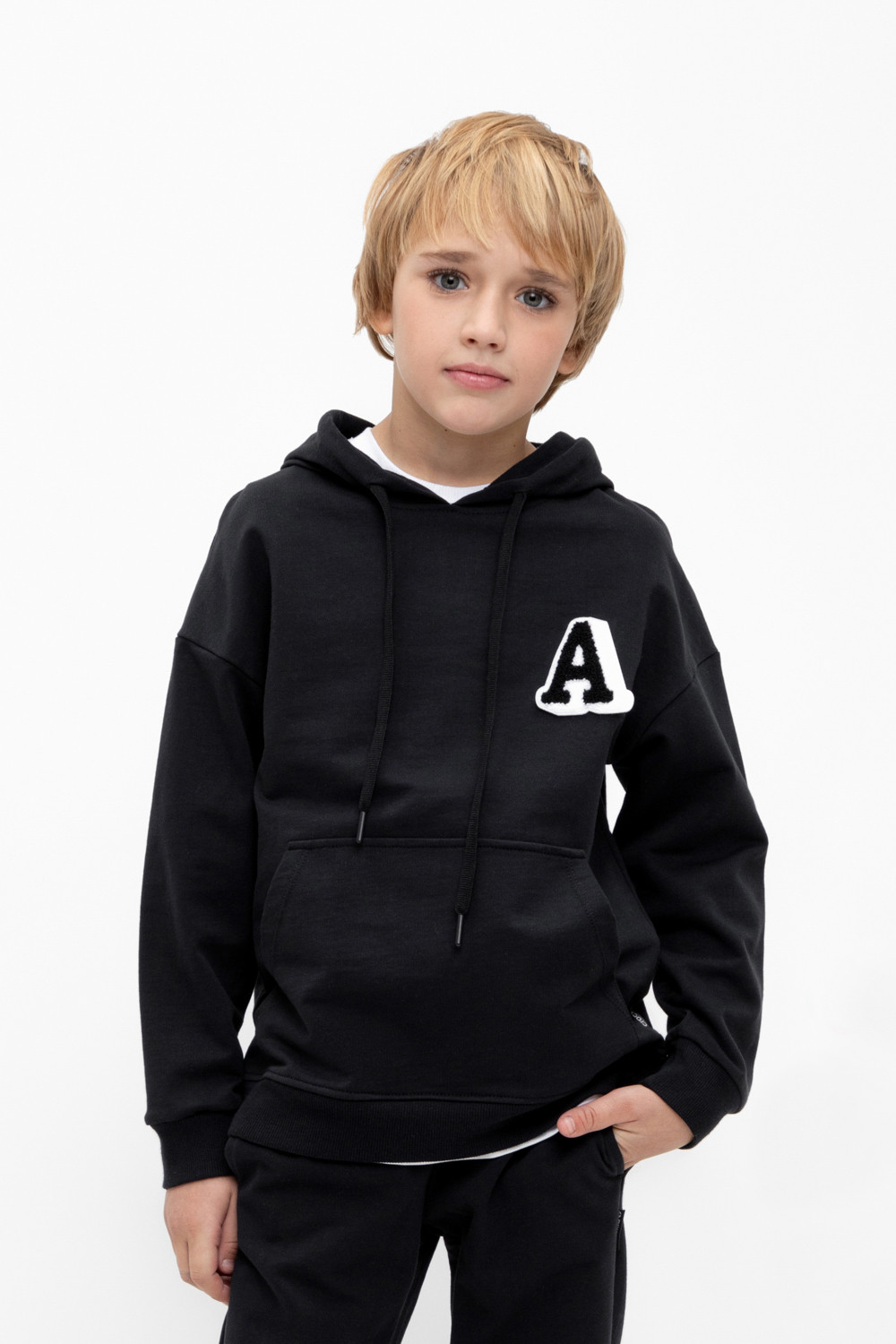 Худи с капюшоном для мальчика из петельчатого футера. Манжеты и пояс из эластичного трикотажа в рубчик. Спереди удобный карман-кенгуру.