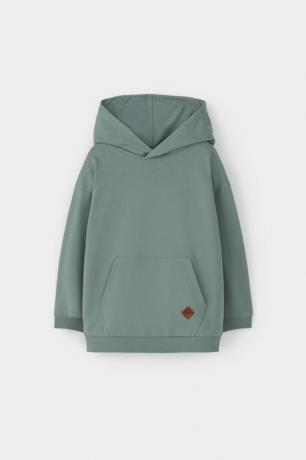 Однотонная трикотажная толстовка с капюшоном из петельчатого футера. Спереди удобный накладной карман-кенгуру. Манжеты и пояс из эластичного трикотажа в рубчик.