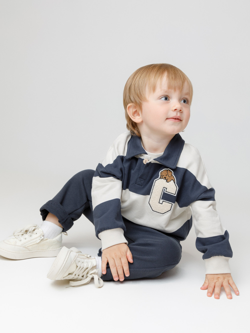 Свитшот с воротником для мальчика. Изготовлен из высококачественного петельчатого футера. Манжеты и пояс выполнены из эластичного полотна. На груди застёжка на пуговицу. Изделие сохраняет цвет и форму после многократных стирок.