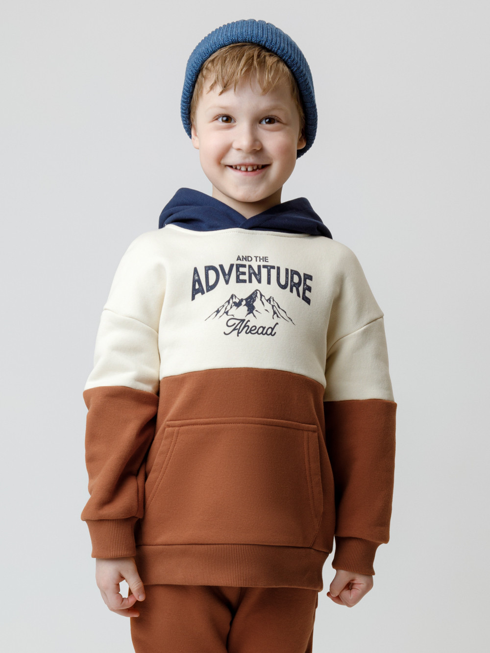 Худи с капюшоном для мальчика из тёплого футера с начёсом. Пояс и манжеты выполнены из мягкого эластичного трикотажа. Спереди удобный и вместительный карман-кенгуру. Худи сохраняет форму и стойкий цвет после многочисленных стирок и идеально подходит на каждый день. Оригинальный принт выполнен из стойких текстильных гипоаллергенных красителей. Все трикотажные полотна производятся в соответствии с нормами швейцарского сертификата ЭкоТекс.