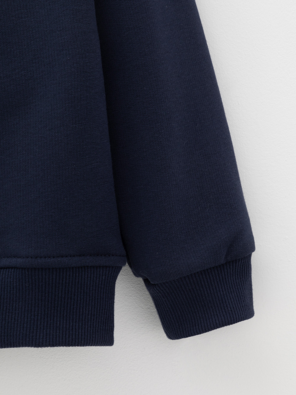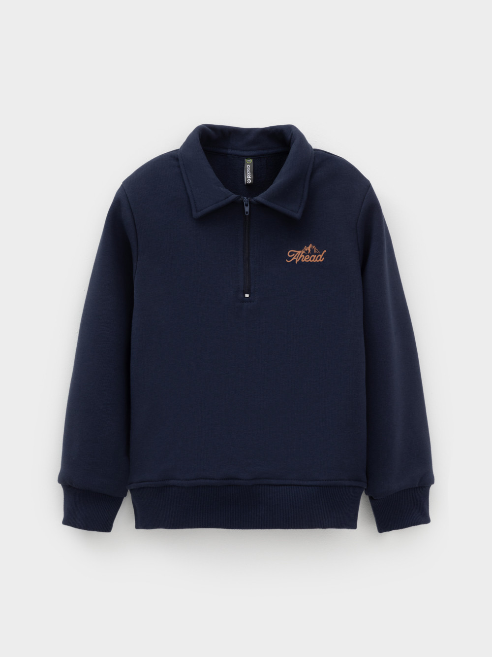 Свитшот с воротником для мальчика. Изготовлен из высококачественного петельчатого футера. В составе 80% натурального хлопка и 20% полиэстера, при этом полиэстер ввязан внутрь по особой технологии и не соприкасается с кожей. Манжеты и пояс выполнены из эластичного полотна. На груди короткая застёжка на молнию. Оригинальный принт выполнен из стойких текстильных гипоаллергенных красителей. Изделие сохраняет цвет и форму после многократных стирок.