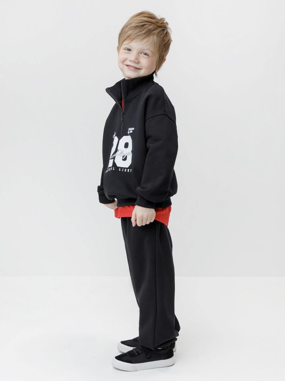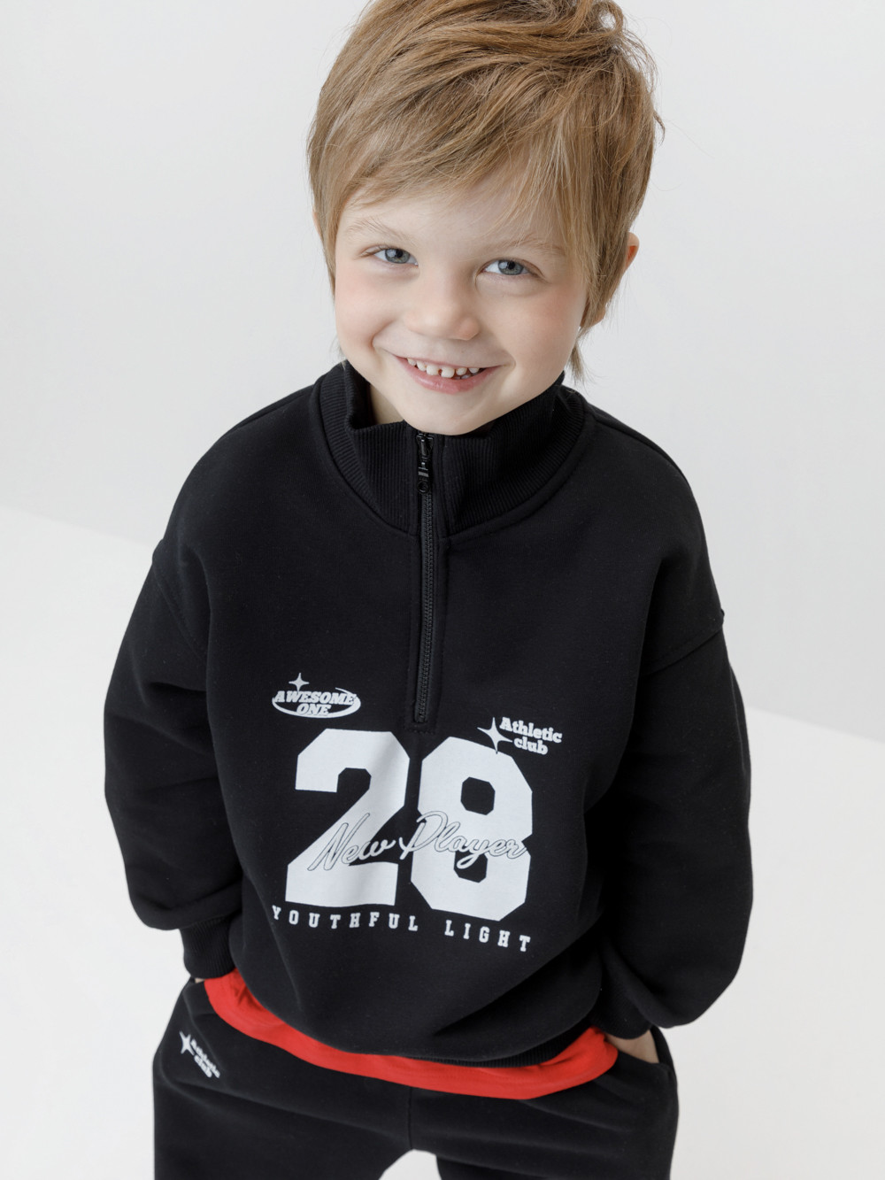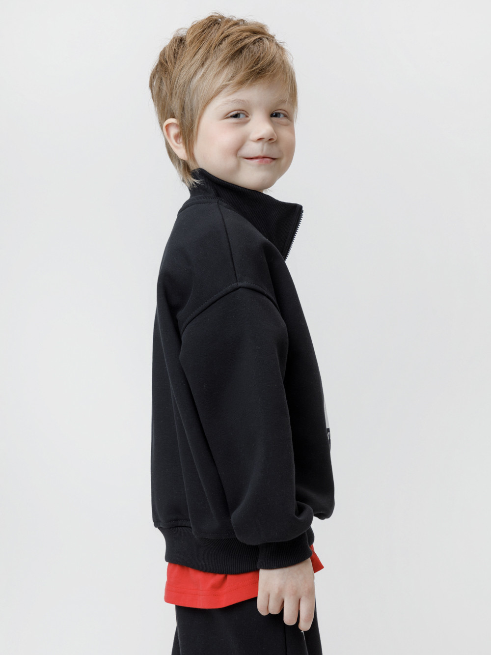 Джемпер из мягкого петельчатого трикотажа для мальчика. У изделия эластичные горловина, манжеты и пояс. Застёгивается на короткую молнию. Оригинальный принт выполнен из стойких текстильных гипоаллергенных красителей. Джемпер сохраняет цвет и форму после многократных стирок. Все трикотажные полотна производятся в соответствии с нормами швейцарского сертификата ЭкоТекс.
