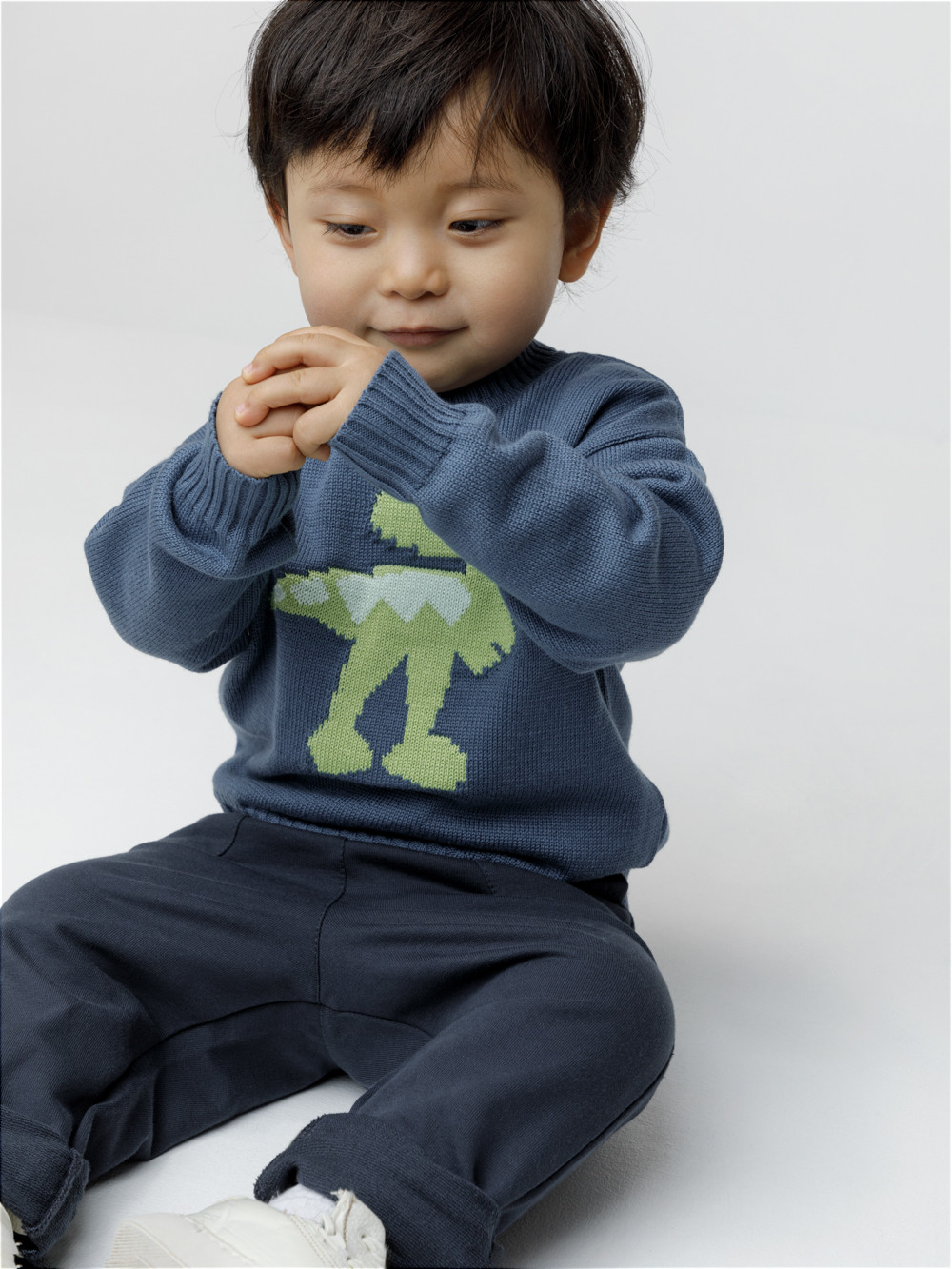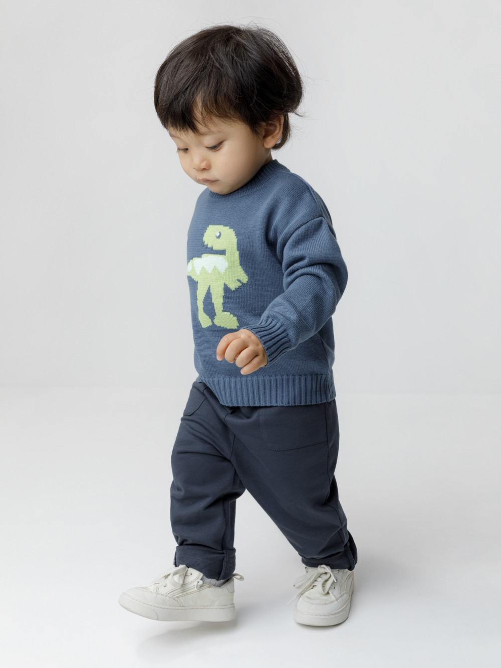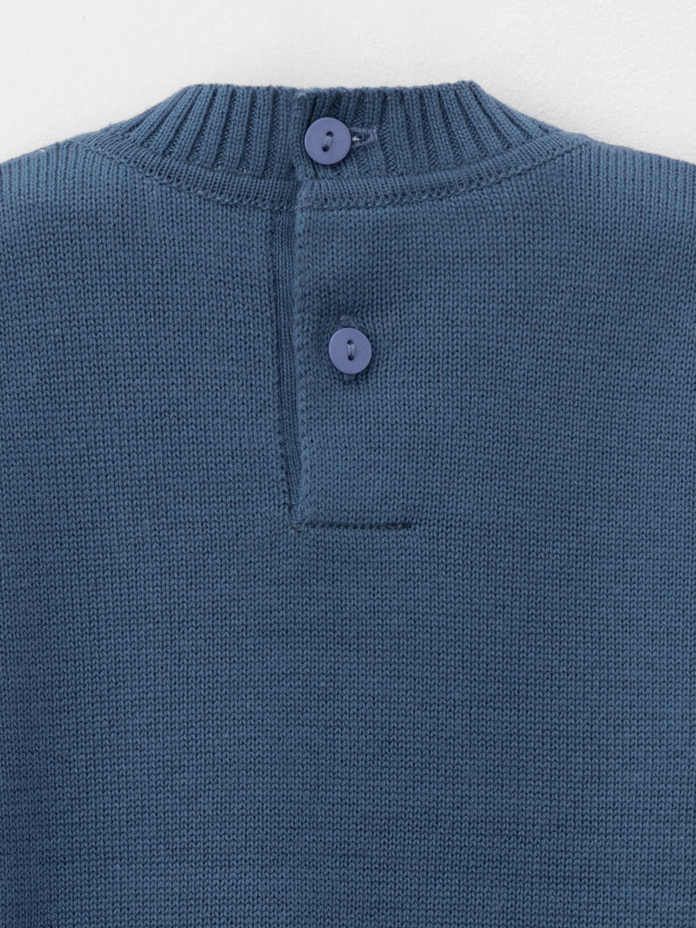 Вязаный джемпер с рисунком для мальчика. Изготовлен из мягкой хлопковой пряжи с добавлением акрила. Длинные рукава с манжетами. Внизу эластичный пояс. На спинке застёжка на пуговицу. Изделие сохраняет форму и стойкий цвет после многочисленных стирок.