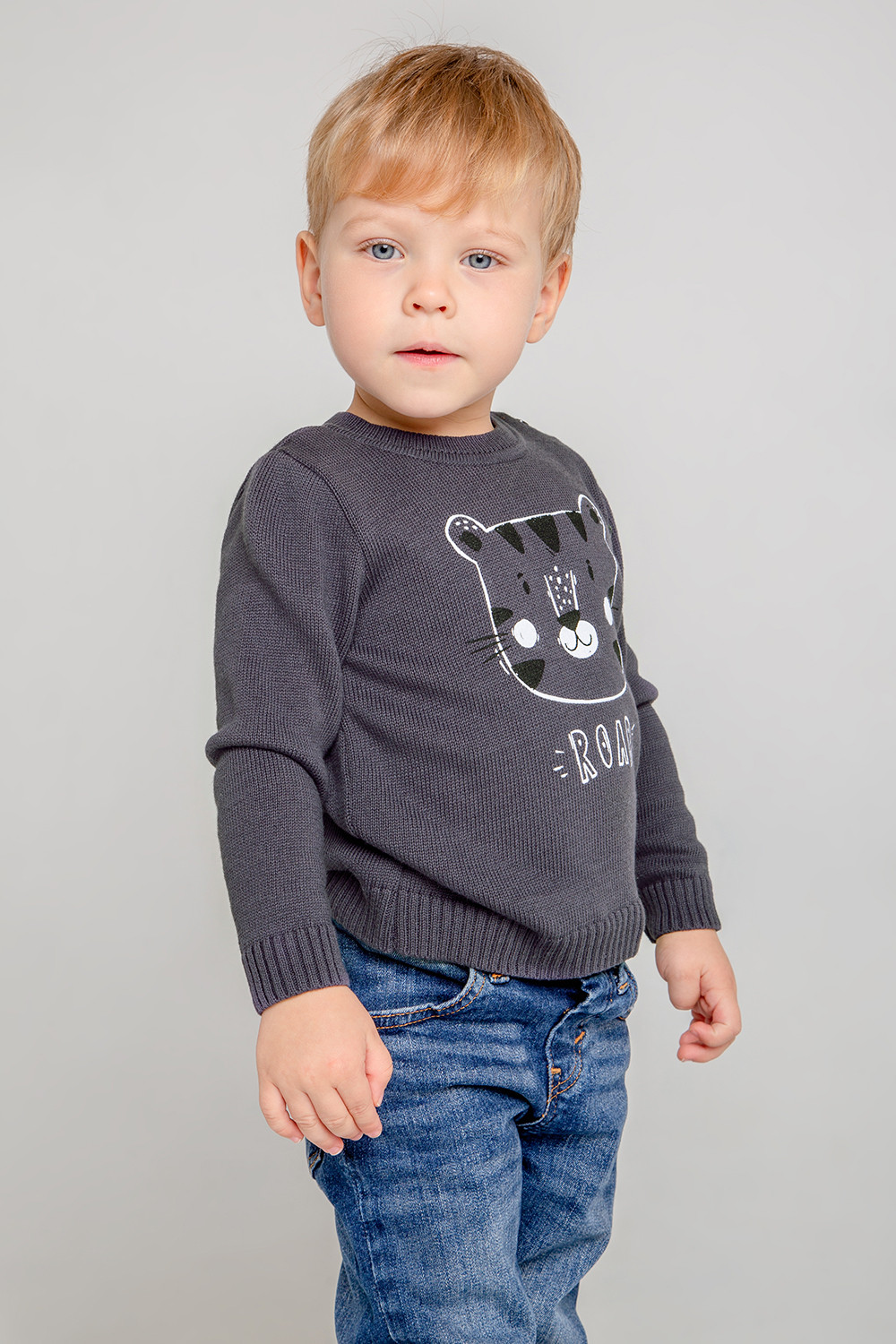 Вязаный джемпер с втачными рукавами. Украшен изображением тигрёнка. Связан из хлопковой пряжи. На рукавах эластичные манжеты. Внизу мягкий пояс. Застёгивается на пуговицу.