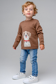 Вязанный джемпер из полушерстяной пряжи в состав которой входит шерсть австралийского мериноса. Горловина, манжеты и низ изделия связаны ластиком. Для удобства изделие застегивается на пуговицы на плече.